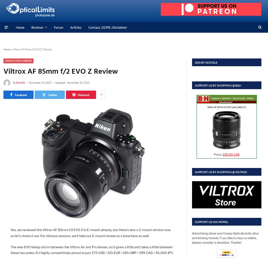 OpticalLimitsが「VILTROX AF 85mm F2.0 EVO」ニコンZマウントのレビューを公開。優れたコストパフォーマンスを発揮し、匹敵する競合製品が存在しないようです。
