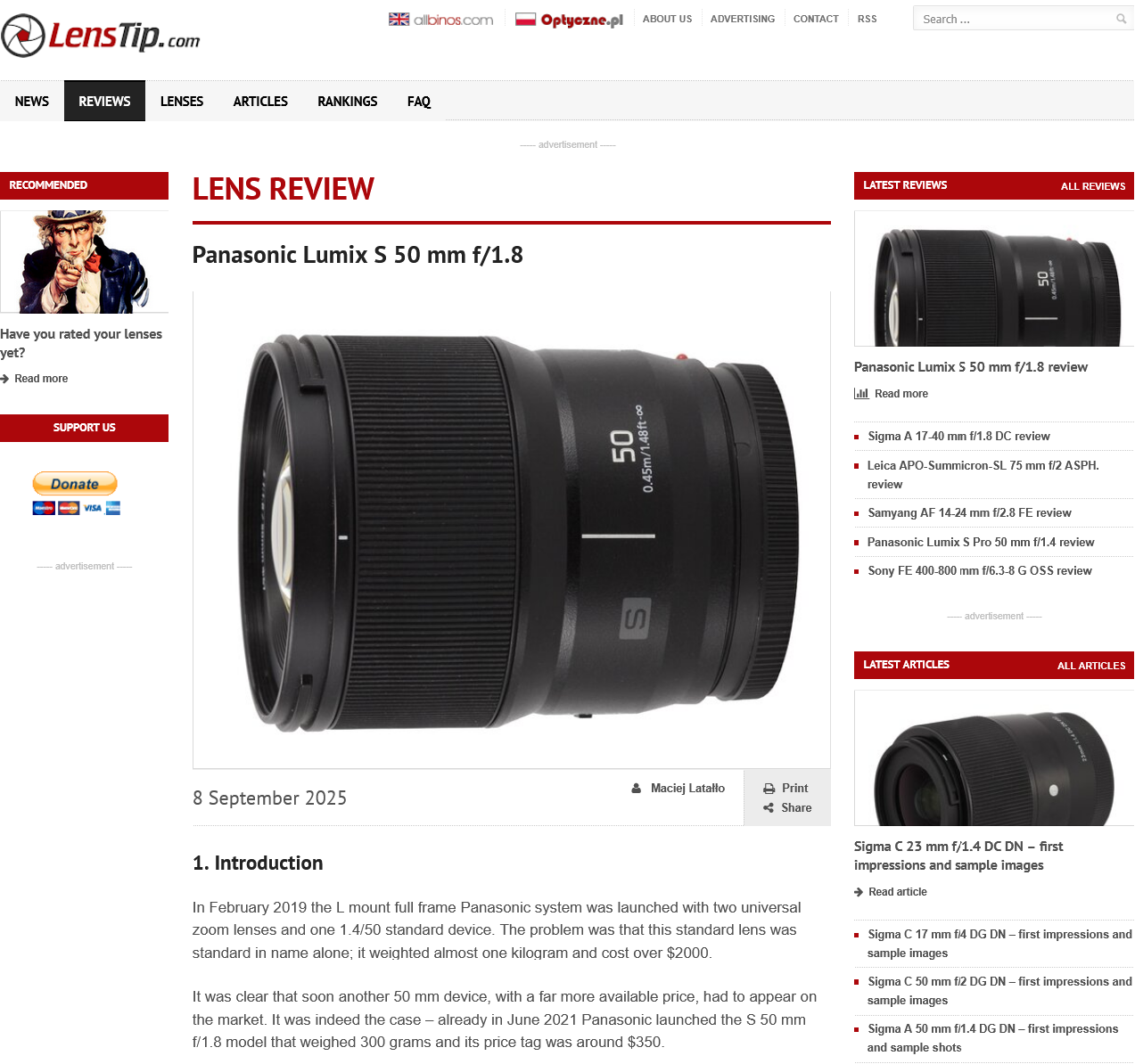 Lenstipがパナソニック「LUMIX S 50mm F1.8」のレビューを公開。価格に見合った光学性能を発揮し、F1.8の絞り開放を活かせるレンズに仕上がっているとのこと。