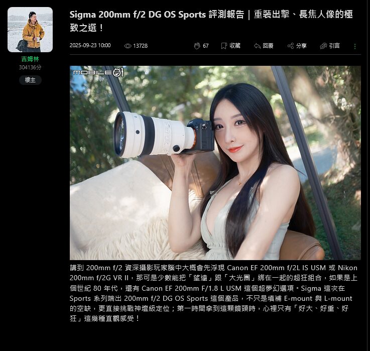Mobile01が「200mm F2 DG OS|Sports」のレビューを公開。最短撮影距離の長さを欠点としつつ、良好な解像性能で収差の補正状態も良好と評価。会員限定ながら高解像度の作例を多数掲載。
