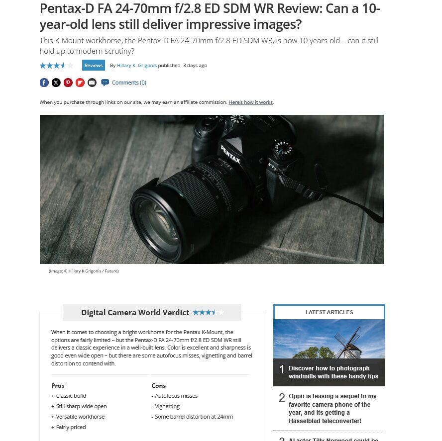 Digital Camera Worldが「HD PENTAX-D FA 24-70mmF2.8ED SDM WR」のレビューを公開。AF精度や歪曲収差、周辺減光などを指摘しつつも、絞り開放から十分に ...