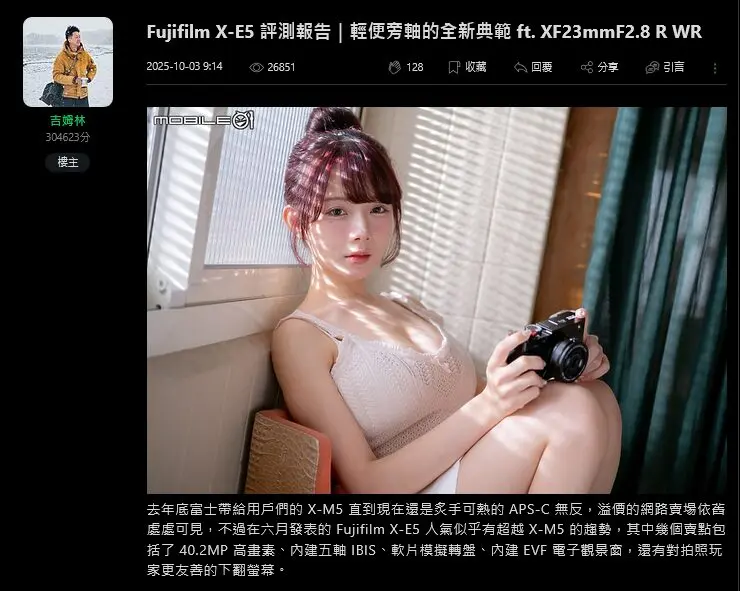 Mobile01が「FUJIFILM X-E5」「XF23mmF2.8 R WR」のレビューを公開。前モデルと比べると高価なカメラとなってしまったものの、デザインと性能の両面で完成度が高いと評価。