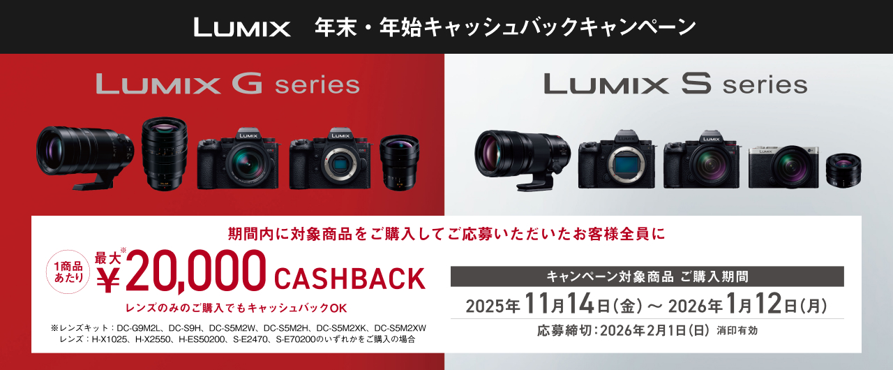 パナソニックが2025年11月14日開始のLUMIX Sシリーズ・LUMIX Gシリーズのキャッシュバックキャンペーンを告知。LEICA DGシリーズレンズや幅広いLUMIX Sシリーズレンズが対象と ...