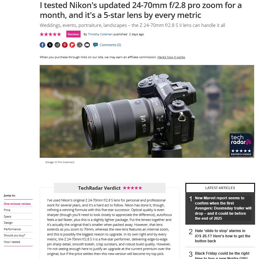 techradarが「NIKKOR Z 24-70mm f/2.8 S II」のレビューを公開。軽量化・光学系簡素化とインナーズーム・画質改善の両立を高く評価。五つ星レンズに違いないとしつつも、前モデ ...