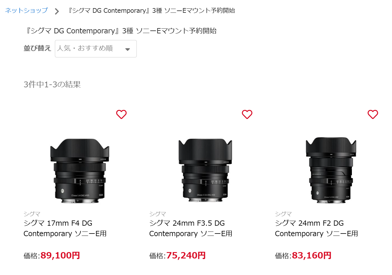 シグマ「17mm F4 DG」「24mm F3.5 DG」「24mm F2 DG」Eマウント予約開始と供給不足の告知