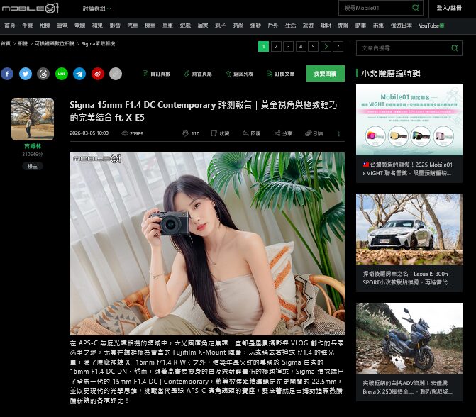 Mobile01が「15mm F1.4 DC」のレビューを公開。。小型軽量化と光学性能を両立し、AF速度や描写性能も含め純正レンズに近い性能を発揮すると評価。前世代の弱点を改善した進化モデルとのこと。