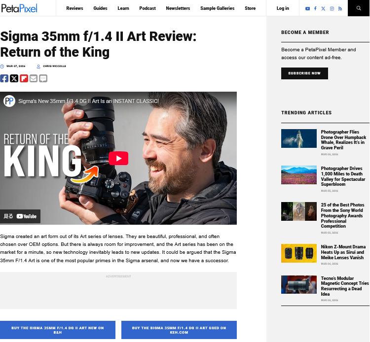 PetaPixelが「35mm F1.4 DG II」のレビューを公開。前モデルより小型軽量化しつつ、弱点を大幅に改善していると評価。ソニーGMと同等で、手頃な価格を実現、ほぼ完璧なレンズとのこと。