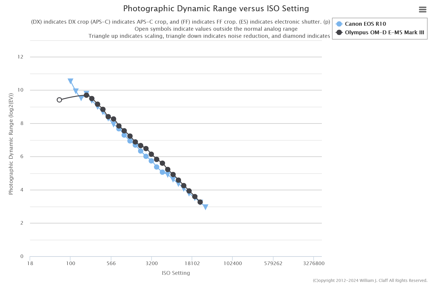 ・R10の測定値がないので、M50 II(Kiss M2)の数値を引用 - *Photons to Photos ダイナミックレンジ・低照度ISO