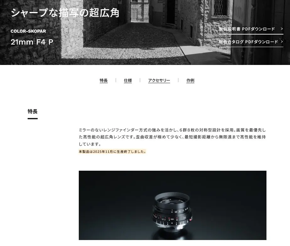コシナが「COLOR-SKOPAR 21mm F4P VM」の生産終了を告知しました。Vintage Line 21mm F3.5が継続していますが、安価で導入しやすい本レンズはディスコンとなる模様。2007年から販売を継続していたロングセラー商品。