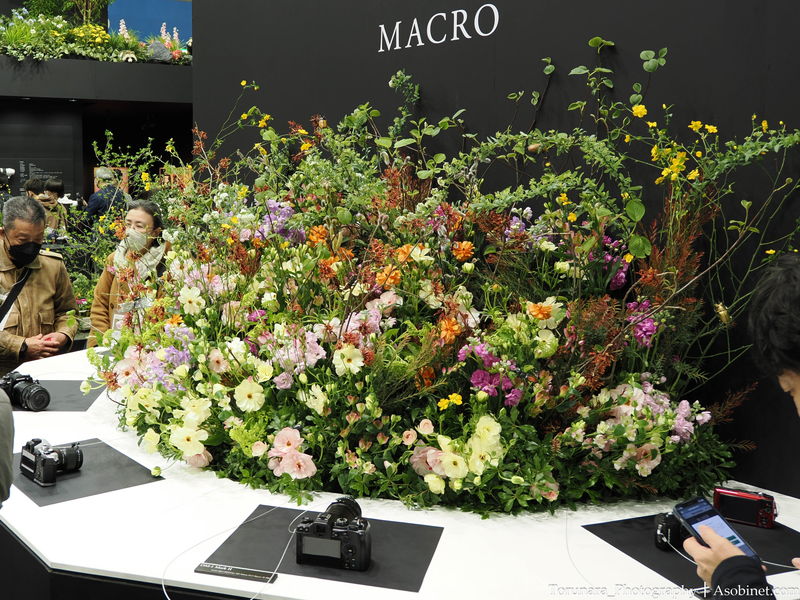 マクロレンズ体験ブースとカメラ体験ブースあり。試用機材はそれなりにあるものの、ブースが狭いので混雑する可能性。手振れ補正を視覚的に見ることができる展示コーナーあり。