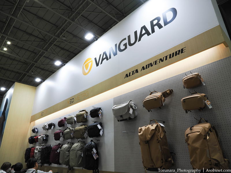 三脚・雲台のほか、カメラバッグなどを展示。時間があればアウトレットを物色したかった。