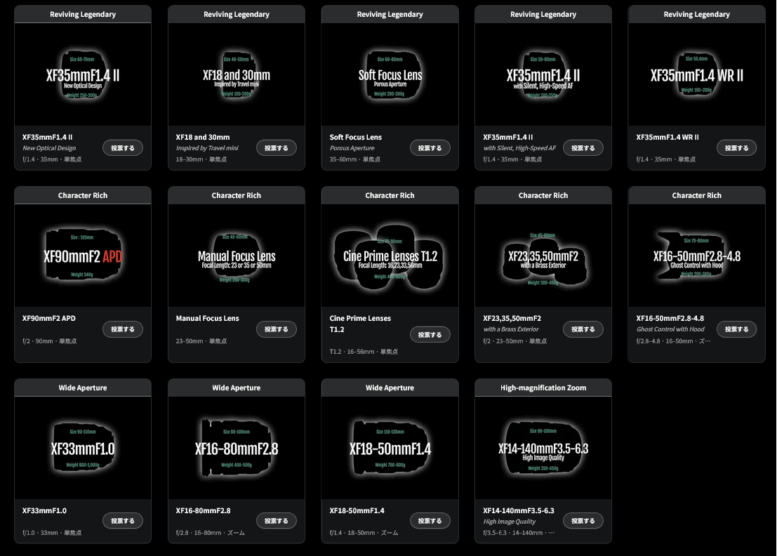 富士フイルムが「FOCUS ON GLASS」の中で構想段階のXマウントレンズを列挙。視聴者が気になるレンズを投票できるウェブページを公開しています。「XF35mmF1.4 II」「MFレンズ」「XF18-50mmF1.4」「真鍮外装 F2」など。