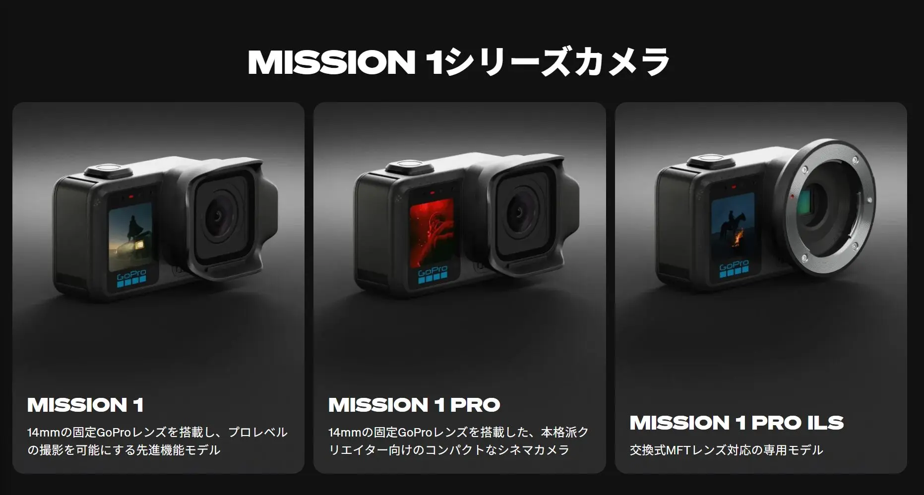 GoProがシネマティックカメラシステム「MISSON 1」シリーズを発表しました。1型50MPセンサー、8K/4Kオープンゲート、超高効率プロセッサGP3、マイクロフォーサーズ用レンズ対応モデルなど。