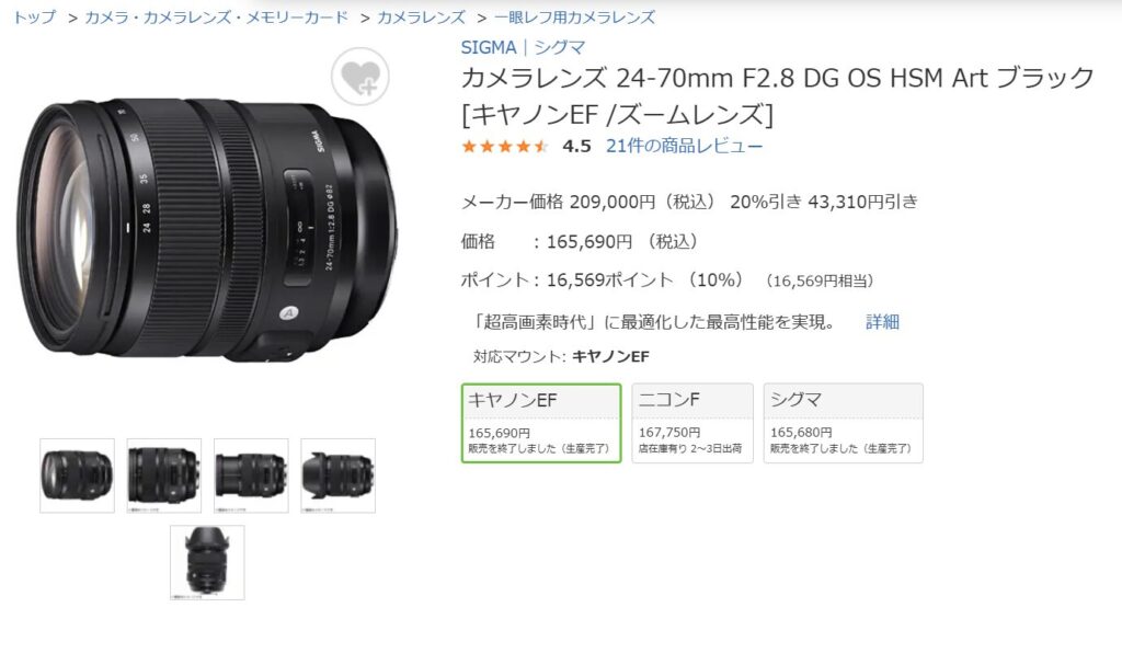 - シグマ 24-70mm F2.8 DG OS HSM 生産完了
