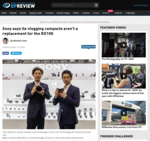 DPReviewがCP+2026におけるソニーへのインタビューを記事として公開。若年層の需要や傾向について、RXシリーズやZVシリーズなどのコンパクトカメラ、α7 V、レンズについてなど。