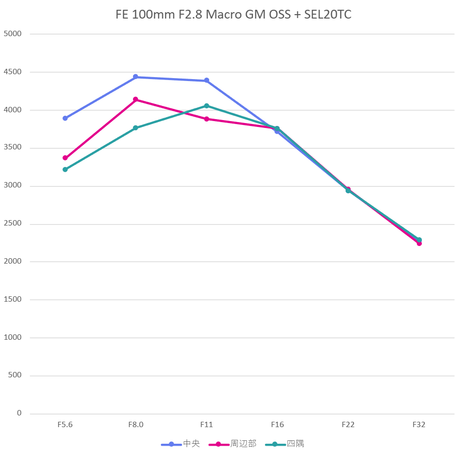 F8付近まで上限値いっぱいの結果が得られ、F11以降は回折の影響で数値が低下します。