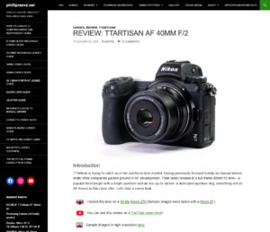 Phillipreeveが銘匠光学「TTArtisan AF 40mm F2」のレビューを公開。周辺減光やフレーム端の画質について指摘しつつ、小型軽量かつ低価格で堅実な性能のレンズと評価。