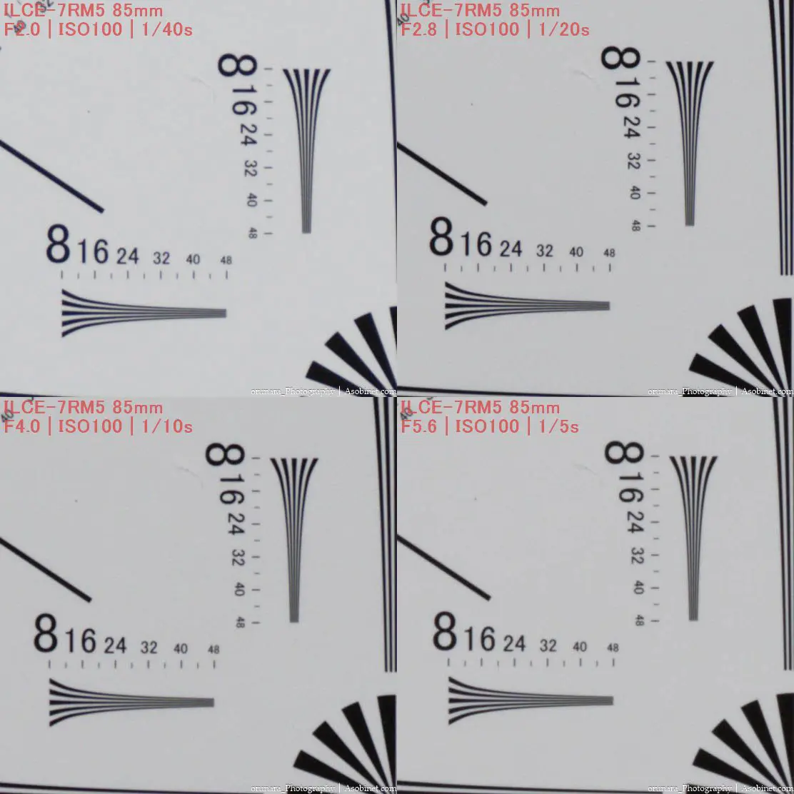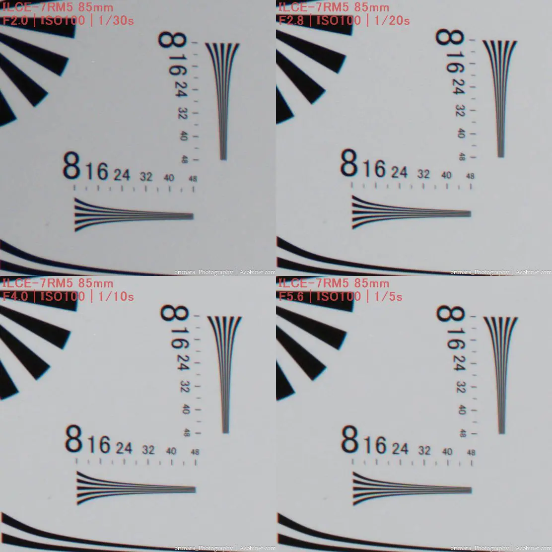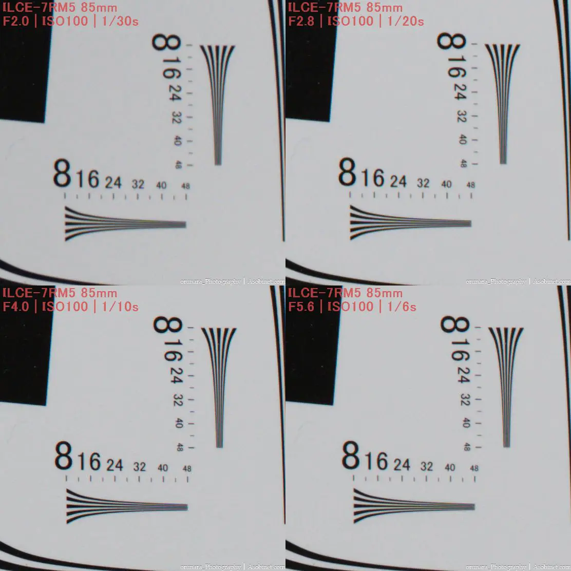 安価な85mmレンズですが、光学性能はF2の絞り開放から非常に良好。近距離での解像チャートテストでも中央から隅まで一貫したパフォーマンスを発揮。近距離では球面収差の変動が大きいレンズもあるなか、安定感が際立っています。