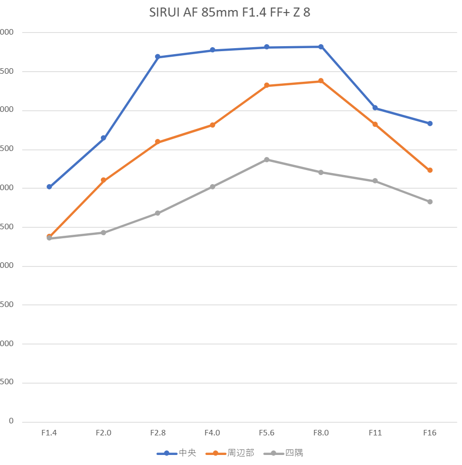 前述したようにフォーカスシフトの影響があり、F4付近でピントの山が遠側に少しずれています。