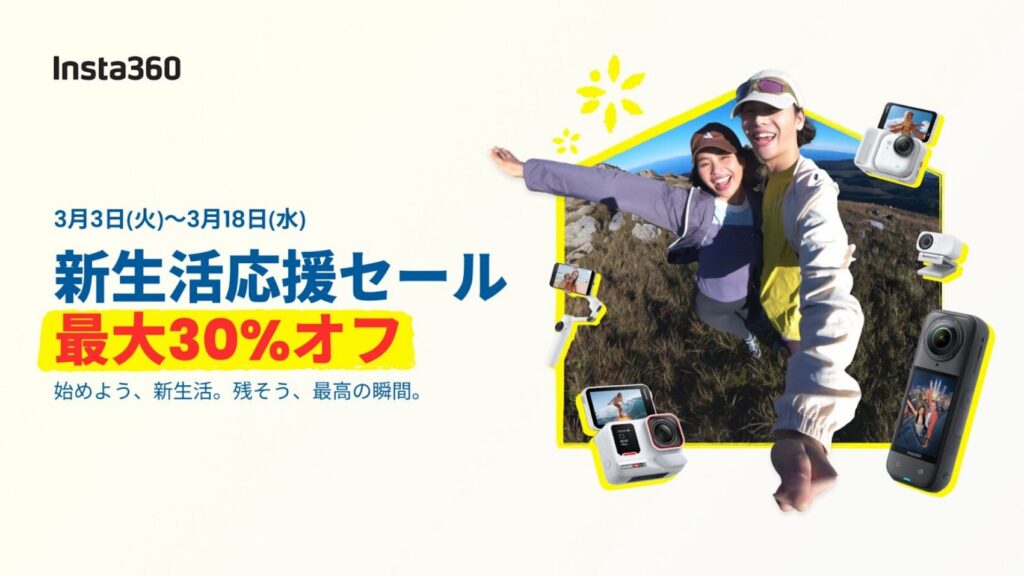 Insta360が2026年3月3日から3月18日までの間、最大30%オフの新生活応援セールを開催。アクションカムや360度カメラ、スマホジンバルなどが15-30%の割引となる模様。