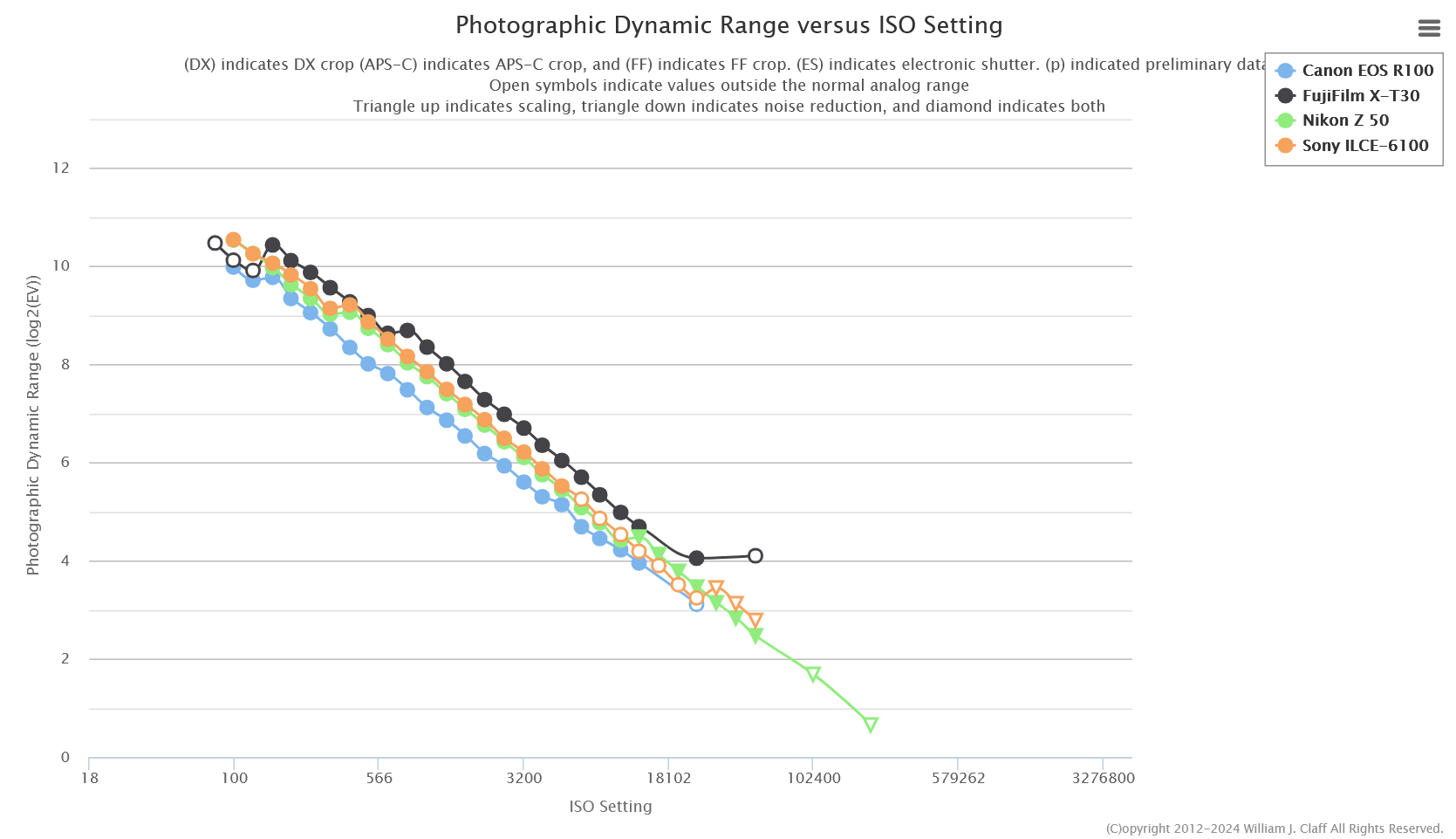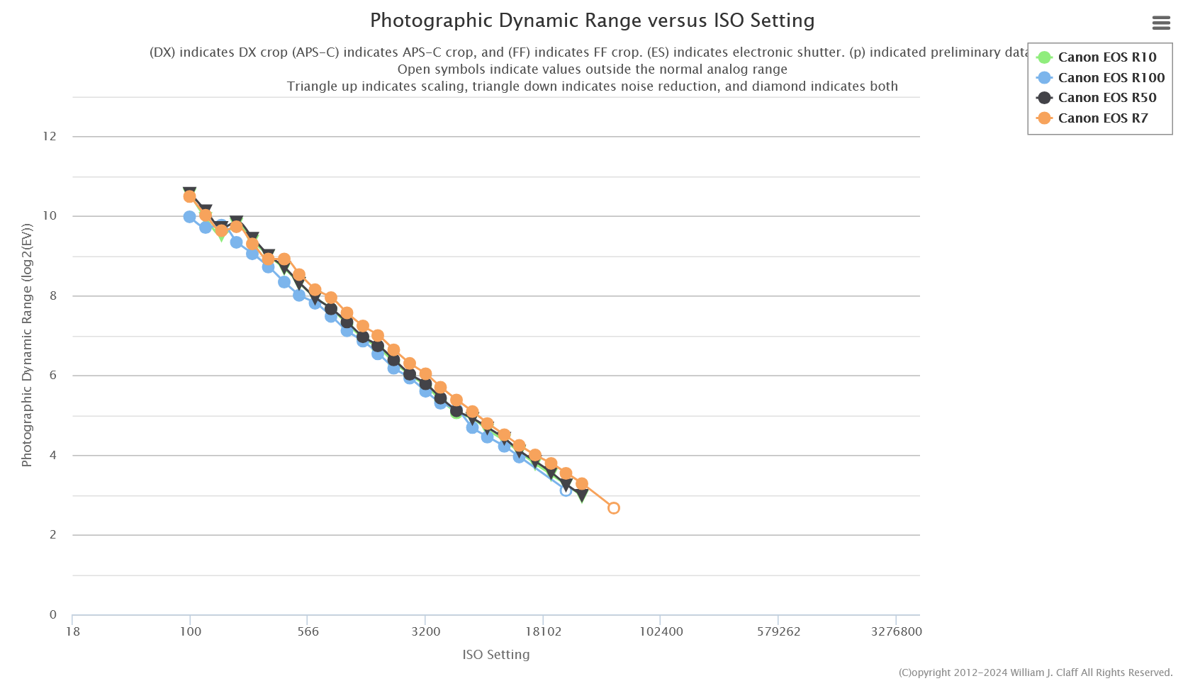 最大PDR 低照度ISO 低照度EV EOS R100 9.98 1640 9.04 EOS R50 10.57 1873 9.23 EOS R10 10.54 1810 9.18 EOS R7 10.49 2213 9.47 EOS Kiss M 9.84 1409 8.82 Z 30 10.54 2442 9.61 Z fc 10.54 2450 9.62 Z 50 10.53 2406 9.59 α6400 10.51 2470 9.63 X-T30 10.47 3645 10.19 E-M5 III 9.69 2475 9.63