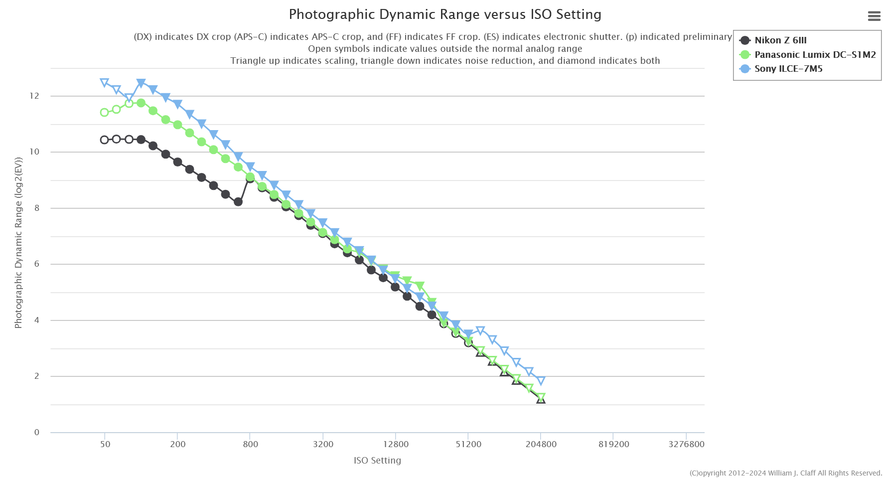 最大PDR 低照度ISO 低照度EV α7 V 12.47 6303 10.98 α7 IV 11.71 5365 10.75 α7 III 11.60 6420 11.00 α9 III 10.00 4646 10.54 S1M2 11.75 5410 10.76 S1RII 11.08 8139 11.35 Z6III 10.46 4709 10.56 Z 6II 11.28 5298 10.73 同シリーズの高解像・高速モデルとの比較