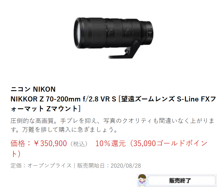 ニコン「NIKKOR Z 70-200mm f/2.8 VR S」がカメラ販売店にて完了商品となっています。既に「II型」が登場している「Z 24-70mm F2.8 S」と同様に生産完了品となるようです。