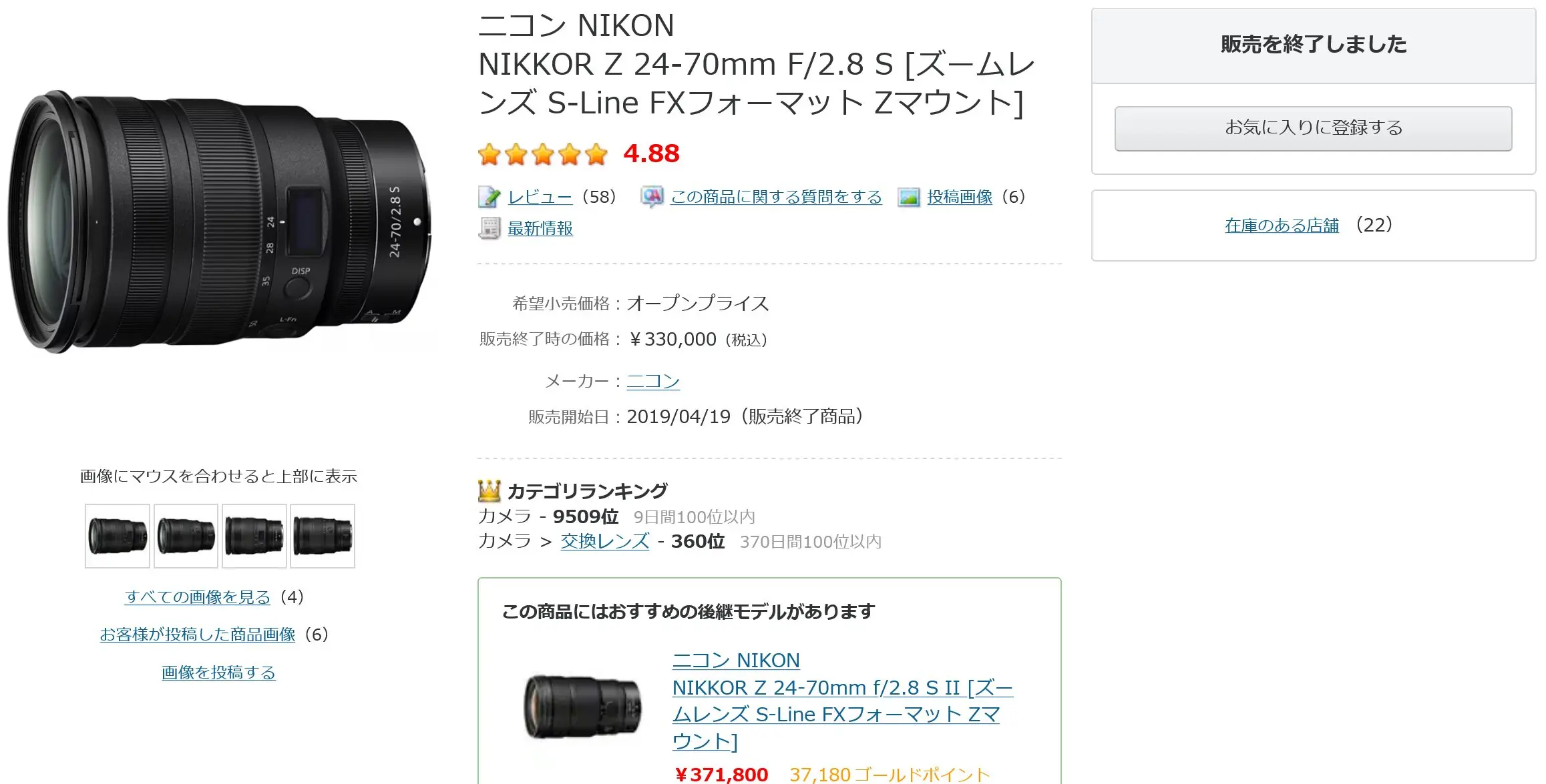 ニコン「NIKKOR Z 24-70mm f/2.8 S」がカメラ販売店にて完了商品となりました。販売中の店舗も多いですが、これから徐々に在庫が無くなっていくと思われます。