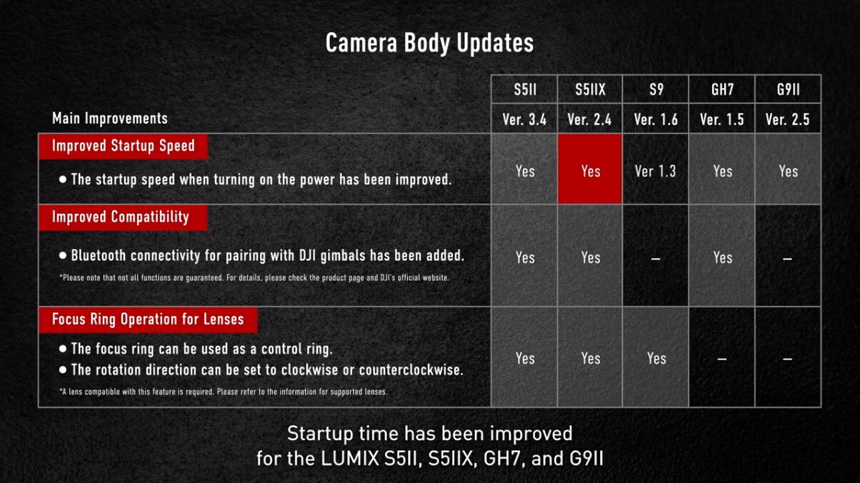 S5II、S5IIX、GH7、G9II向けファームウェア更新では、Lumix Flow対応の追加、起動時間の改善、DJI第4世代RSシリーズジンバルとのBluetooth接続機能の追加が約束されている。