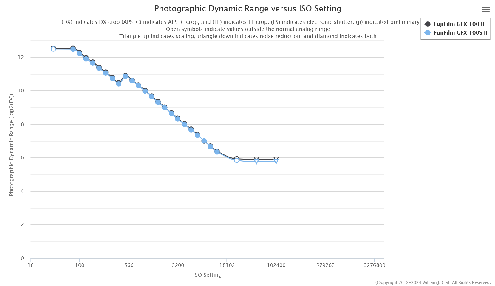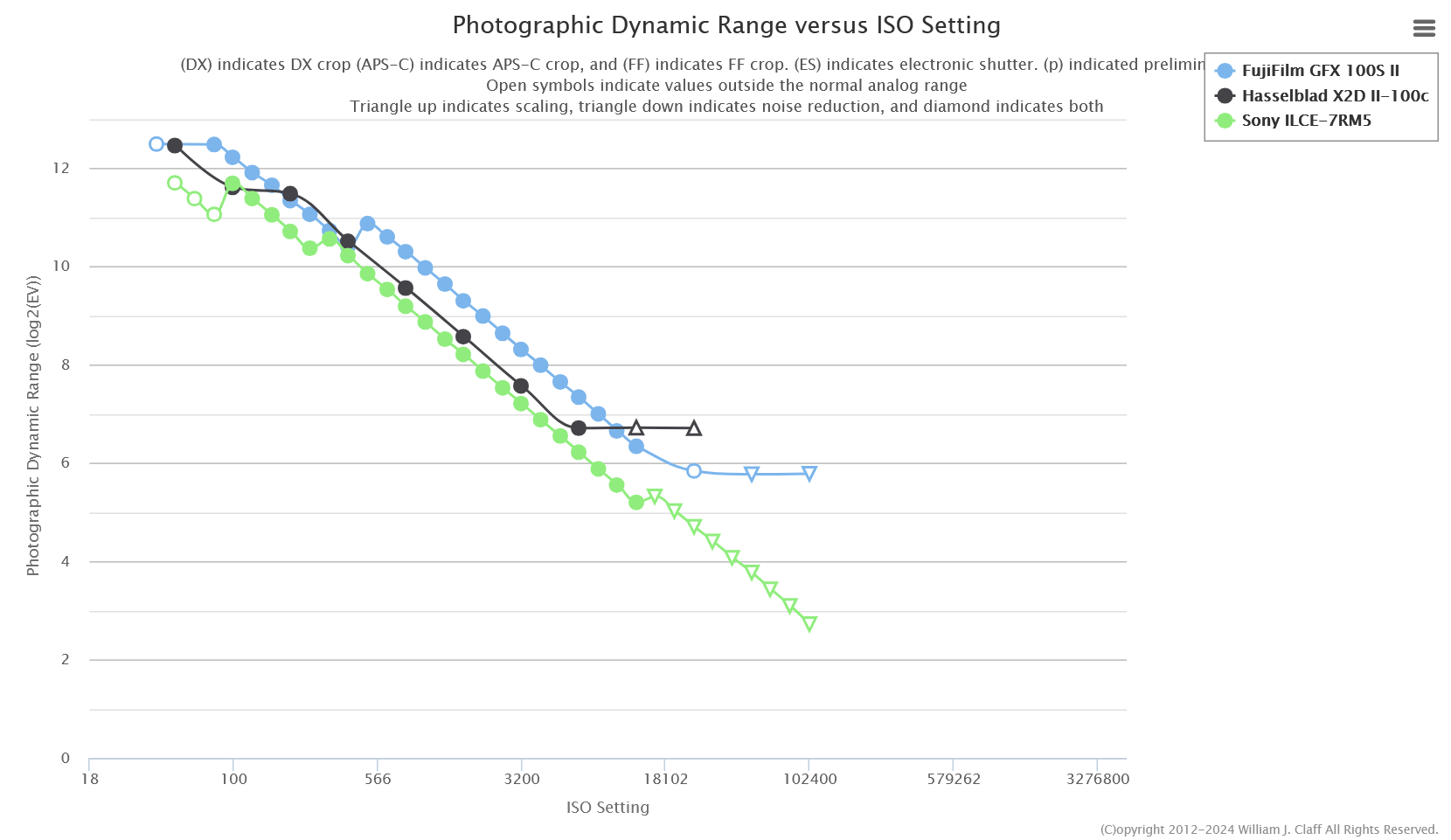 最大PDR 低照度ISO 低照度EV GFX100S II 12.49 11372 11.83 GFX100 II 12.55 11665 11.87 GFX100 12.30 10413 11.70 GFX100S 12.33 10926 11.77 GFX50S II 11.77 5508 10.78 X2D II 12.46 7414 11.21 X2D 12.32 7077 11.14 X1D 11.98 9058 11.50 X-T5 10.43 2230 9.48 SL3 11.24 5171 10.69 α7R V 11.70 5244 10.71 α1 11.36 5215 10.70 EOS R5 11.85 5435 10.76 Z7II 11.60 4157 10.38 S1R 11.37 4522 10.50 fp L 11.39 8388 11.39