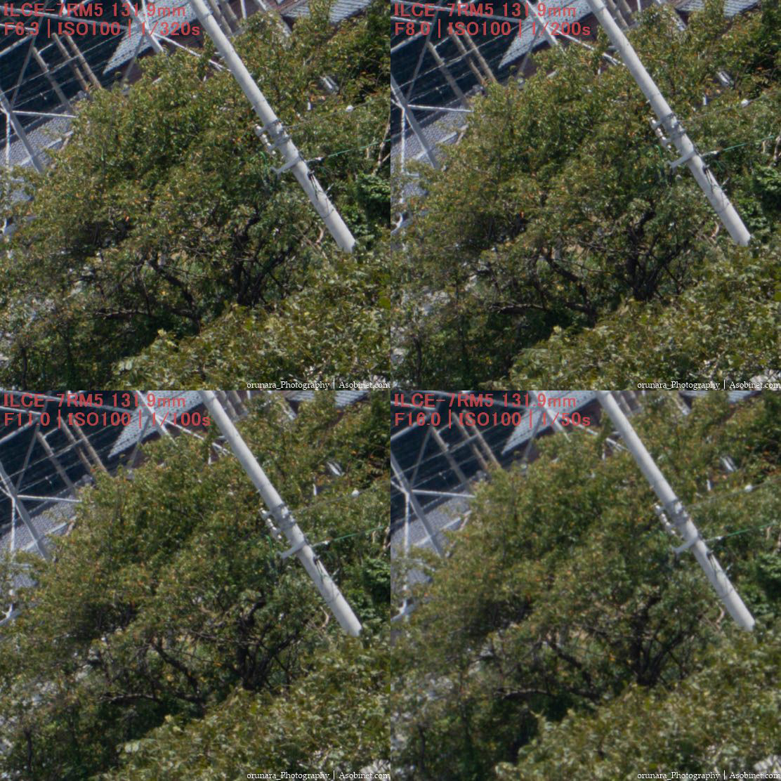 中央は20mmに引き続き、絞り開放からとてもシャープ。回折の影響が強くなるまで画質に変化はありません。