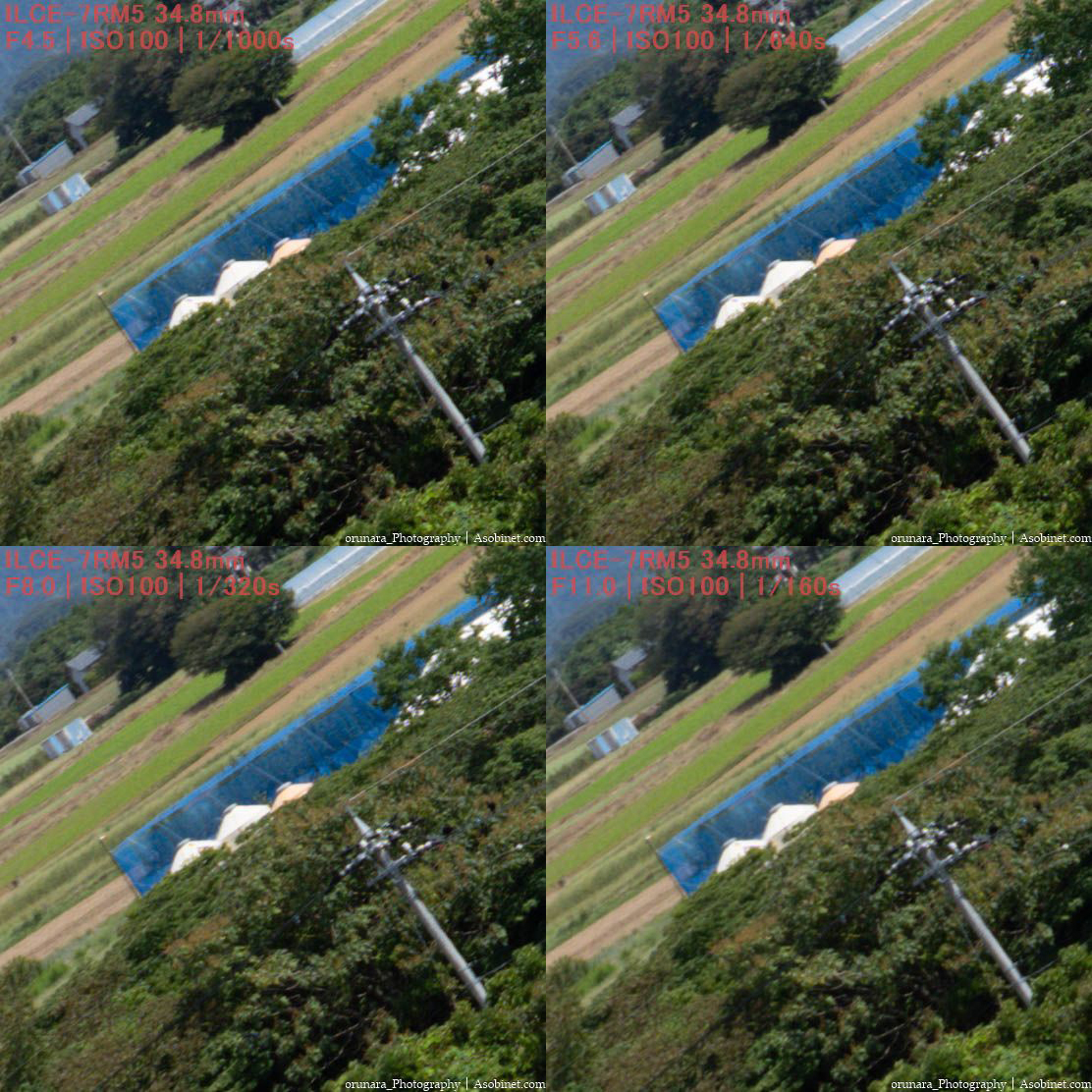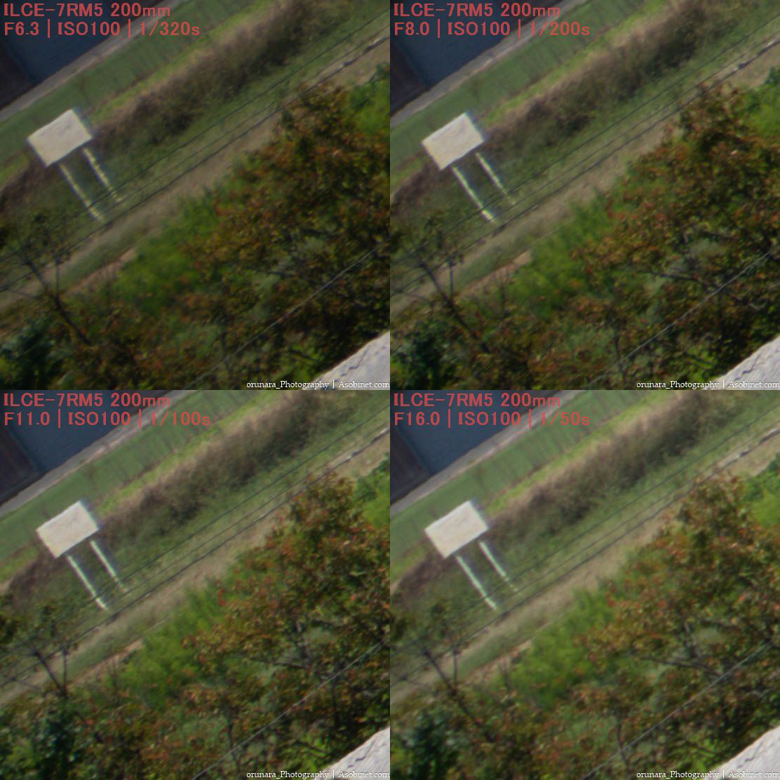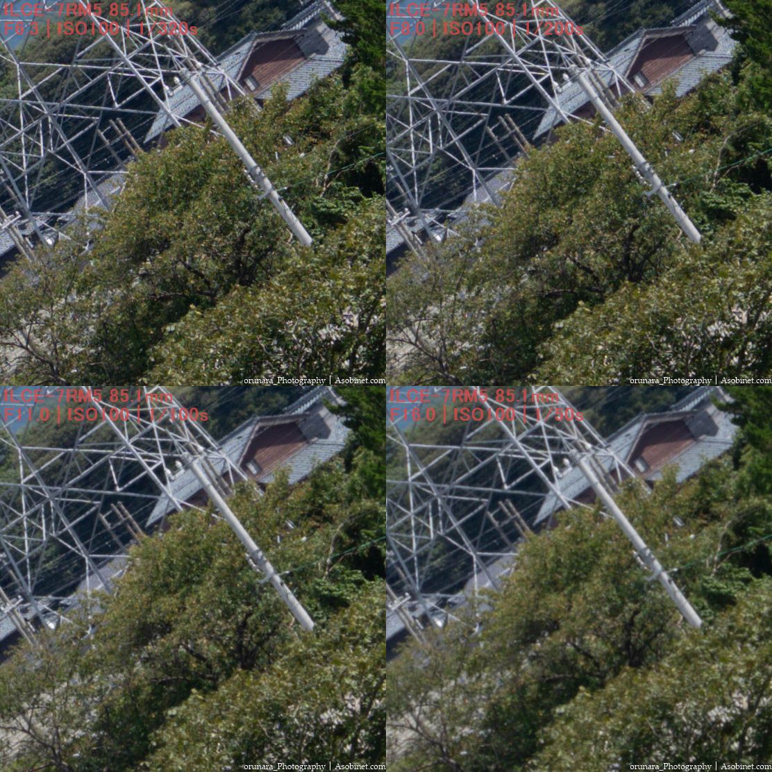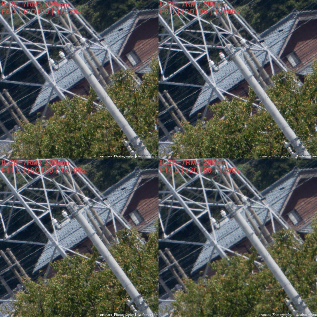周辺部は中央と比べるとややソフトですが、絞ると少し改善します。絞っても中央に追い付くことはありませんが、良像と言える範囲内で問題無し。