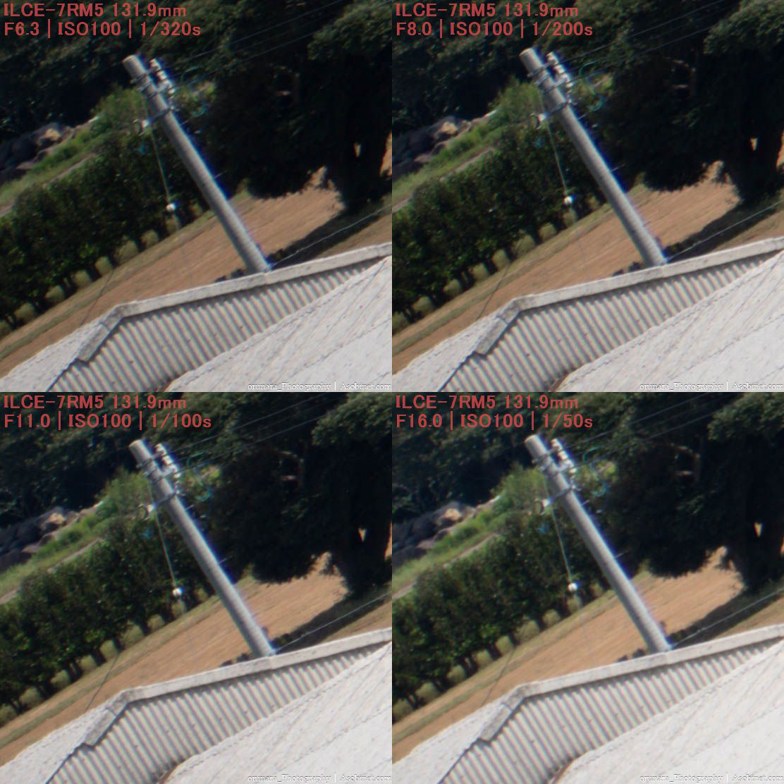 広角や標準域と比べると、細部の再現は低下しているように見えます。しかし、コントラストは依然として良好で、解像感は高い。絞りによる変化はほとんどありません。