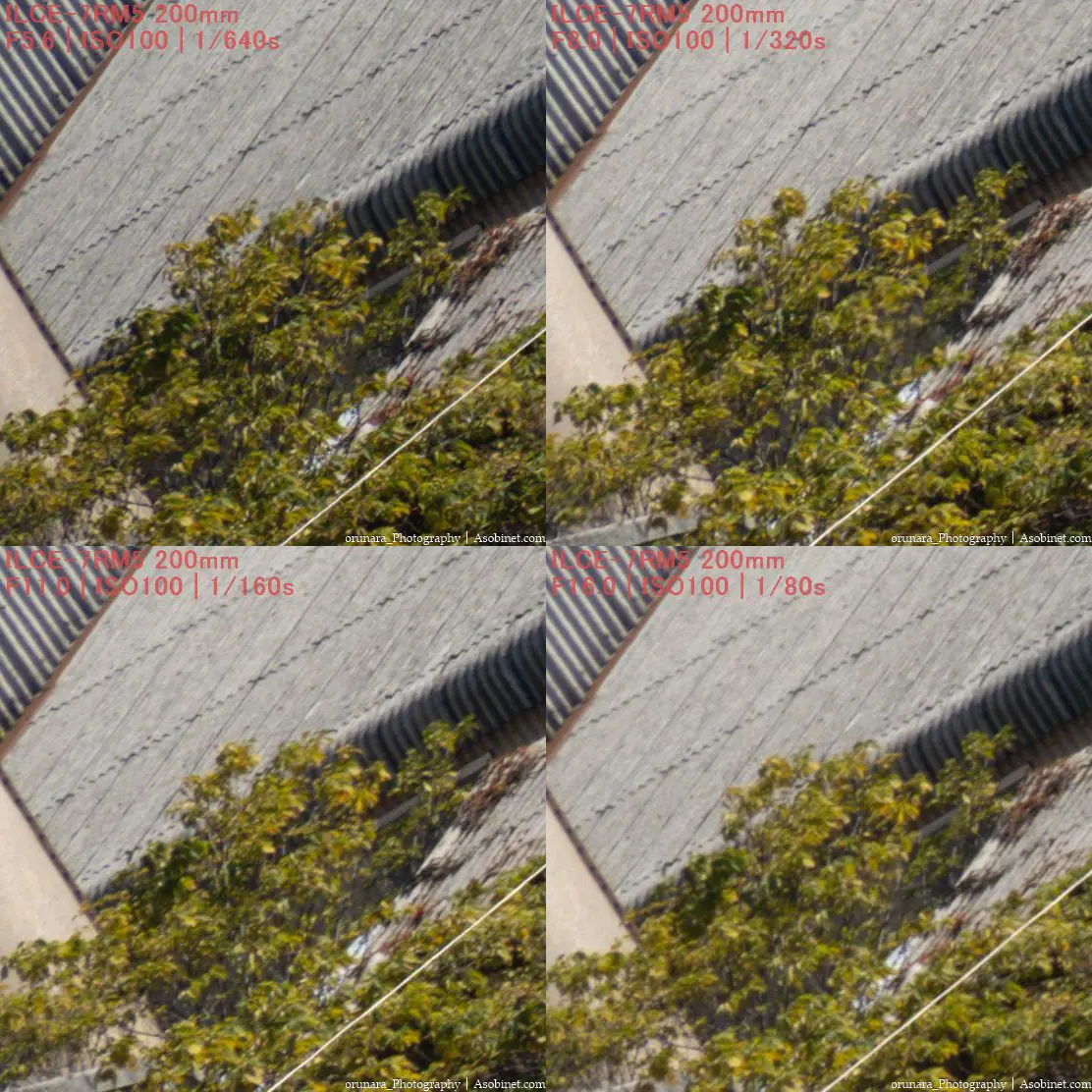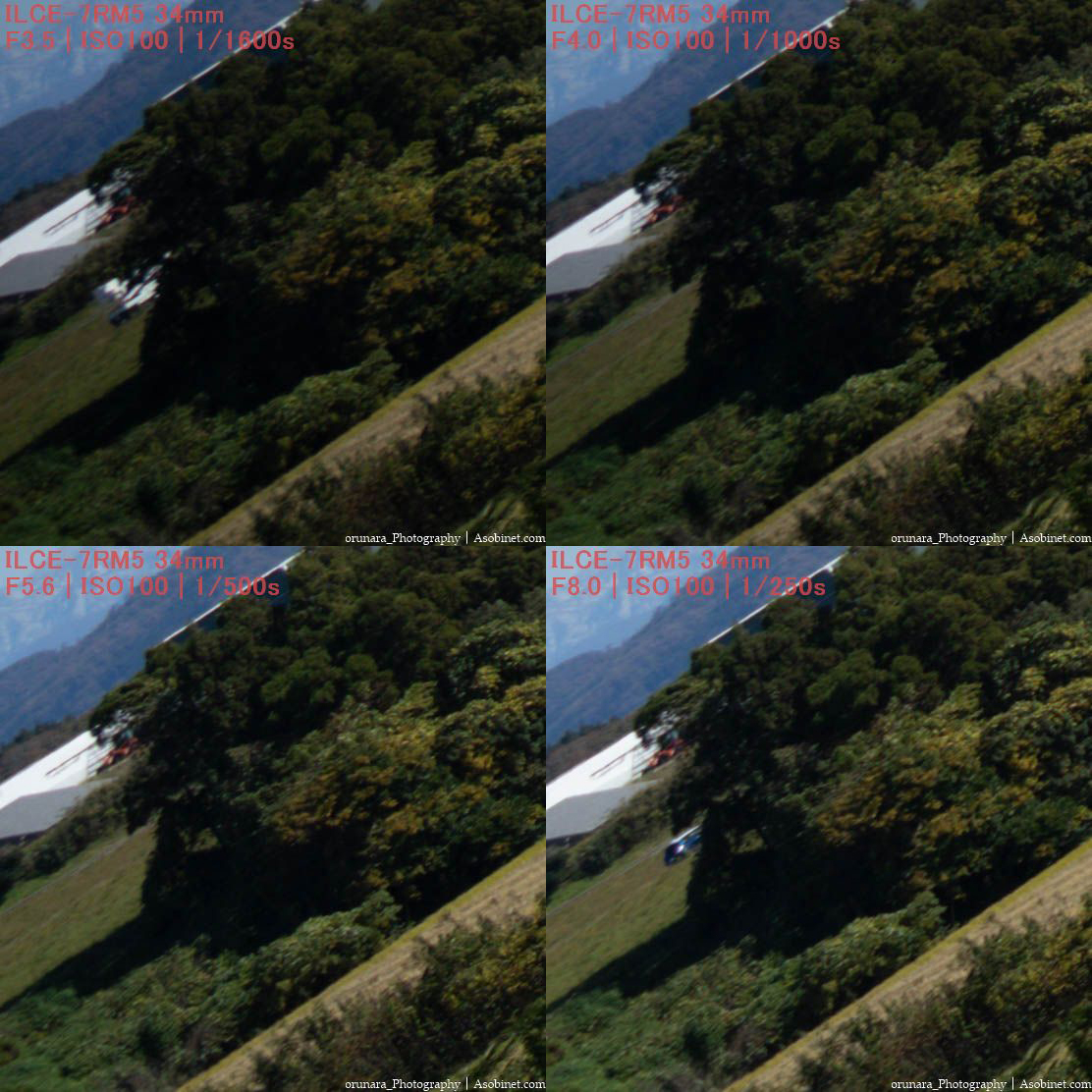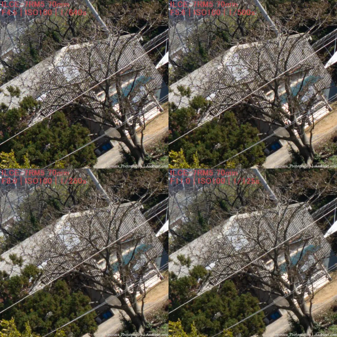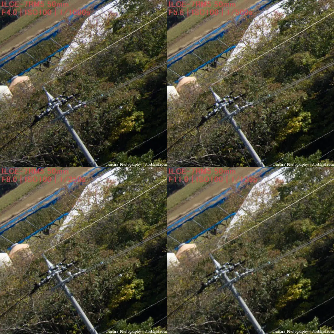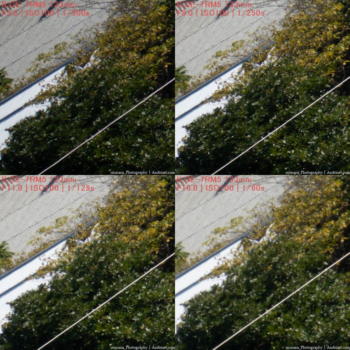 • 中央:絞り開放からピークの画質で、絞り値による大きな変化は無し。
