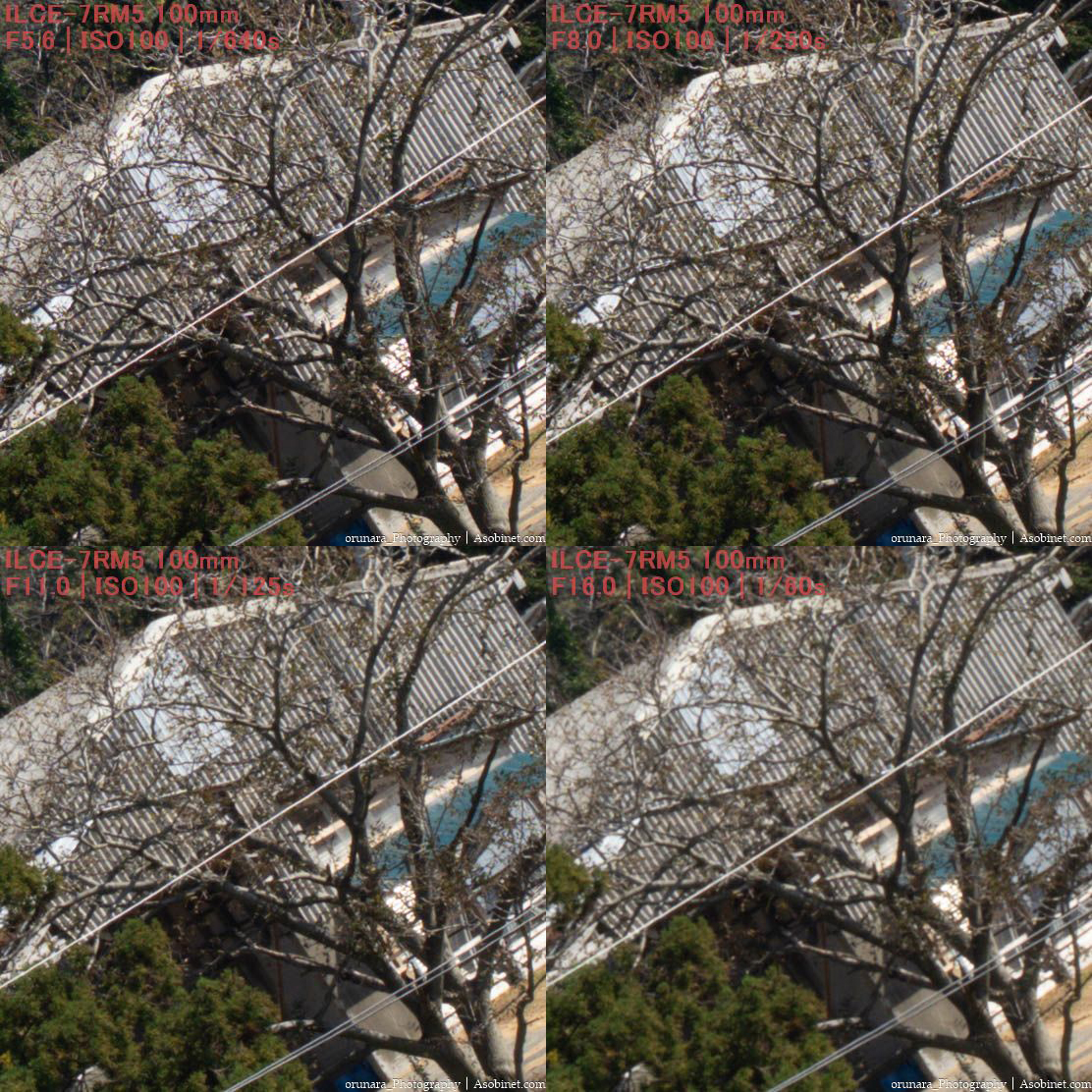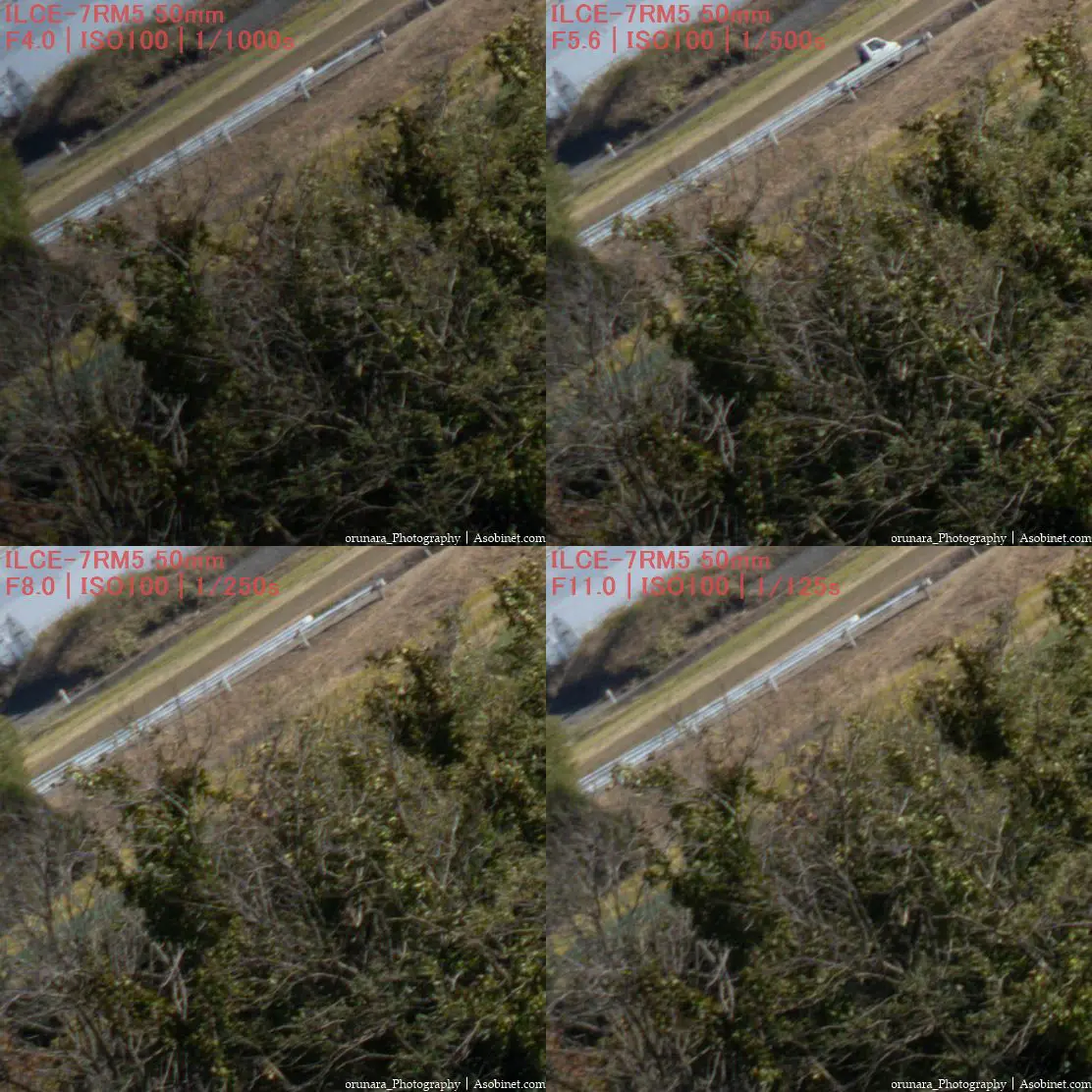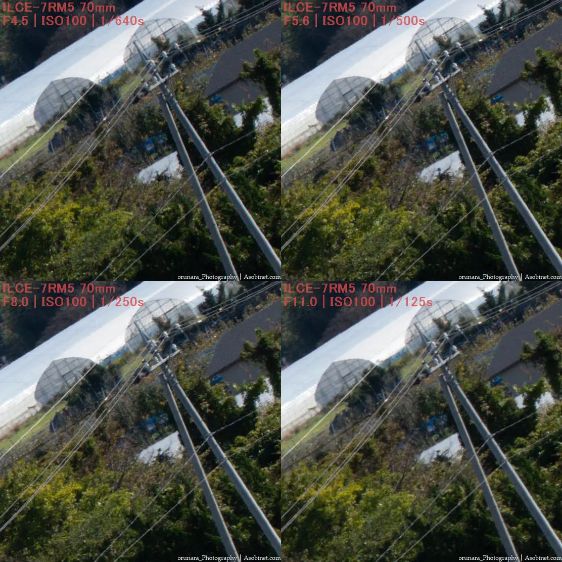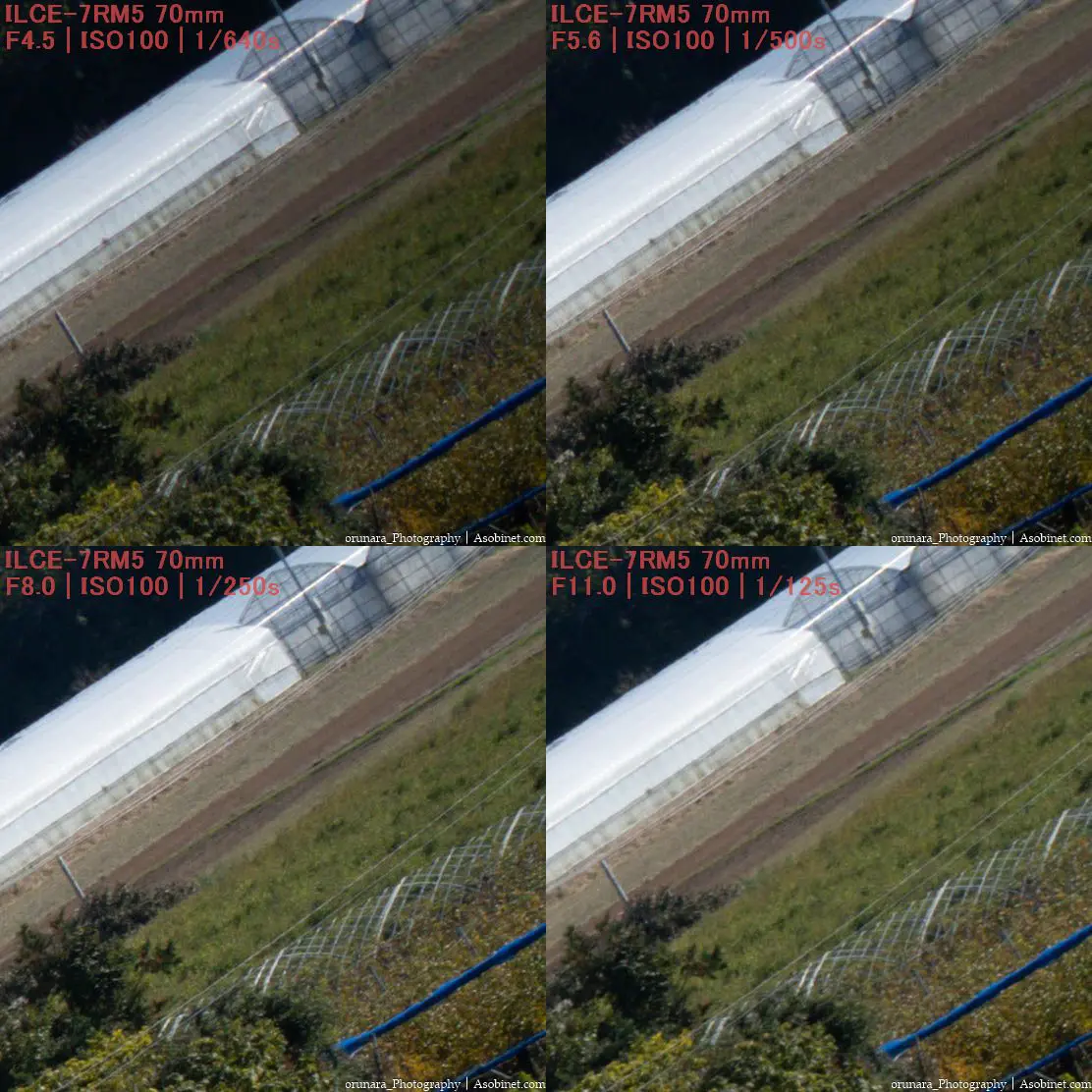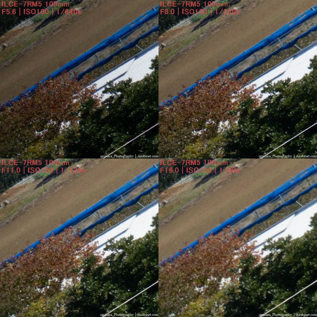 • 中央:絞り開放からピークの画質で、絞り値による大きな変化は無し。