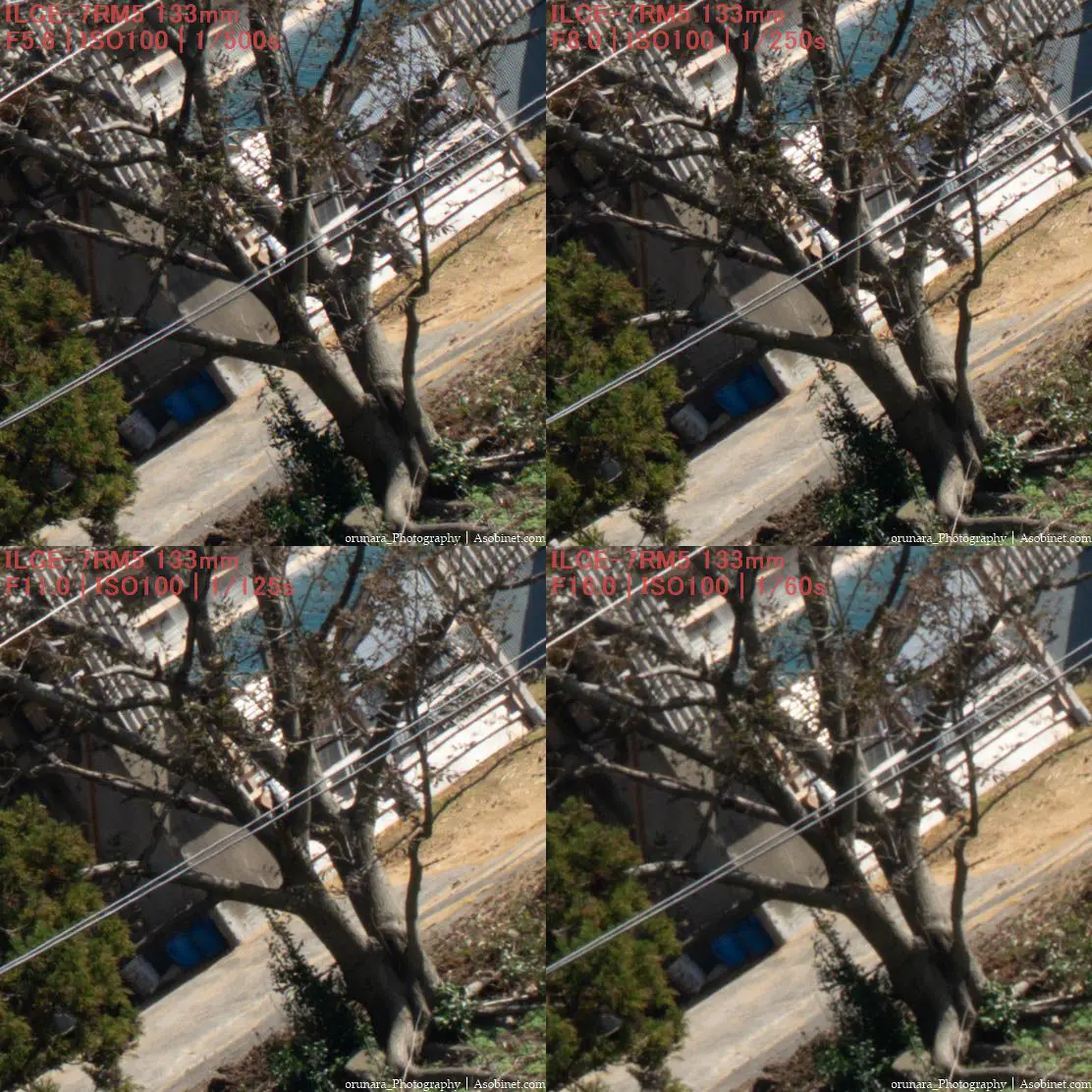 • 隅:中央や周辺と比べるとコントラストが若干低め。絞っても大きな変化はない。