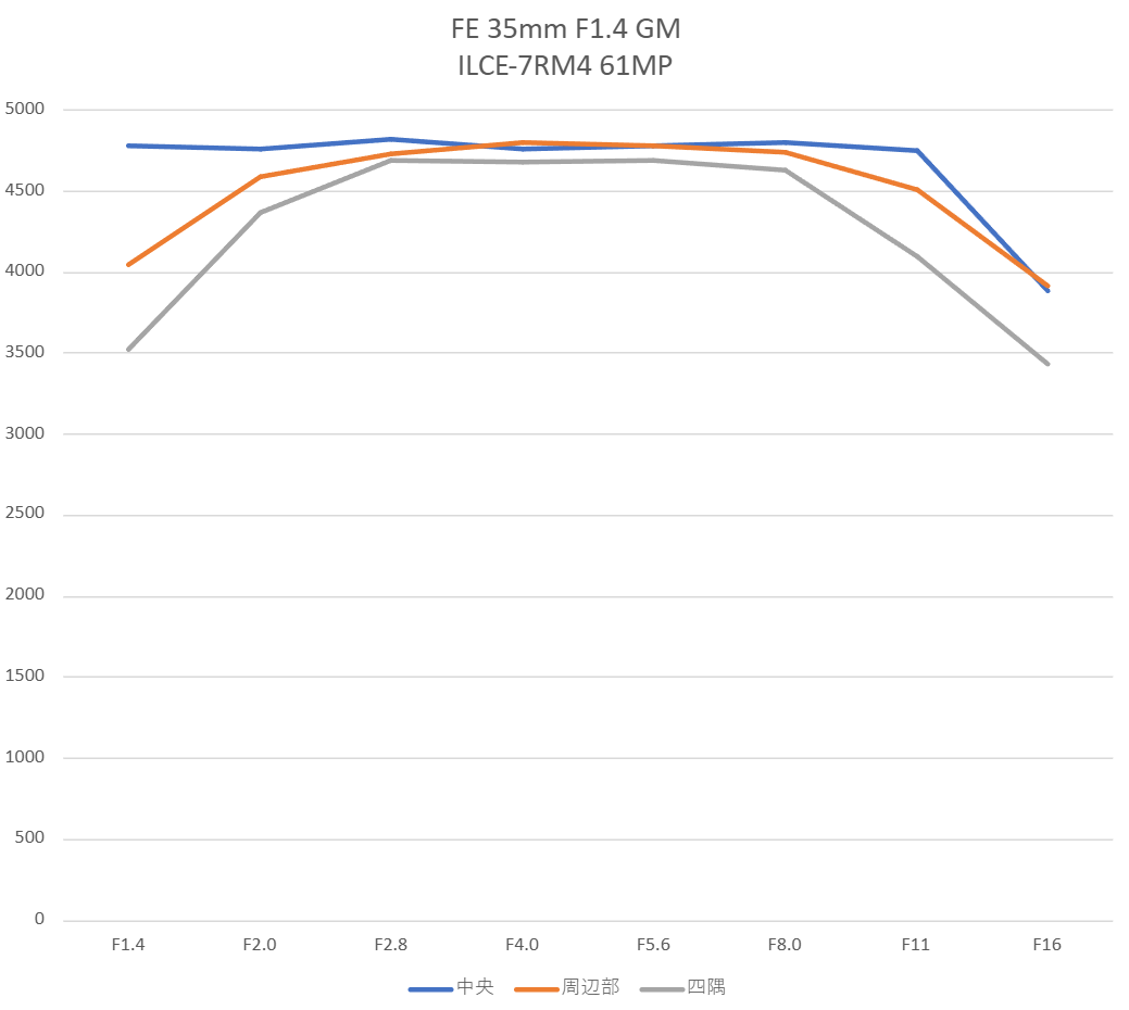 F1.4で僅かにソフトですが、F2.8のピークに向かって改善します。F2.8以降はソニーGMに近い結果ですが、細部のコントラストはGMが若干良好。