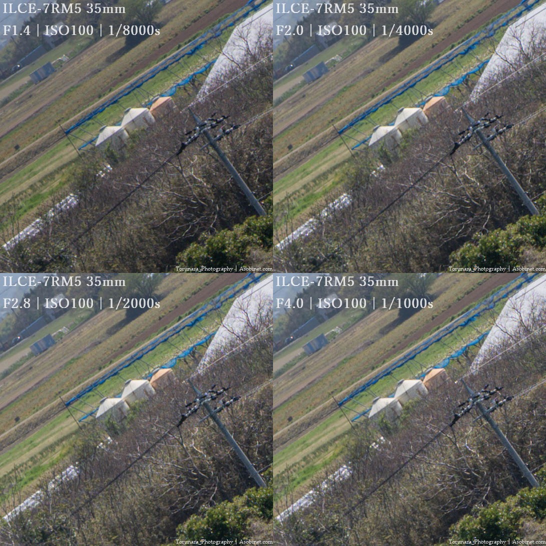 F1.4からとても良好。F2.8まで絞ると、細部のコントラストが少し改善しているように見えます。とはいえ、ブラインドで画質差を見分けられるか怪しいレベルの僅かな改善幅。絞り開放からほぼピークの性能と言えるでしょう。