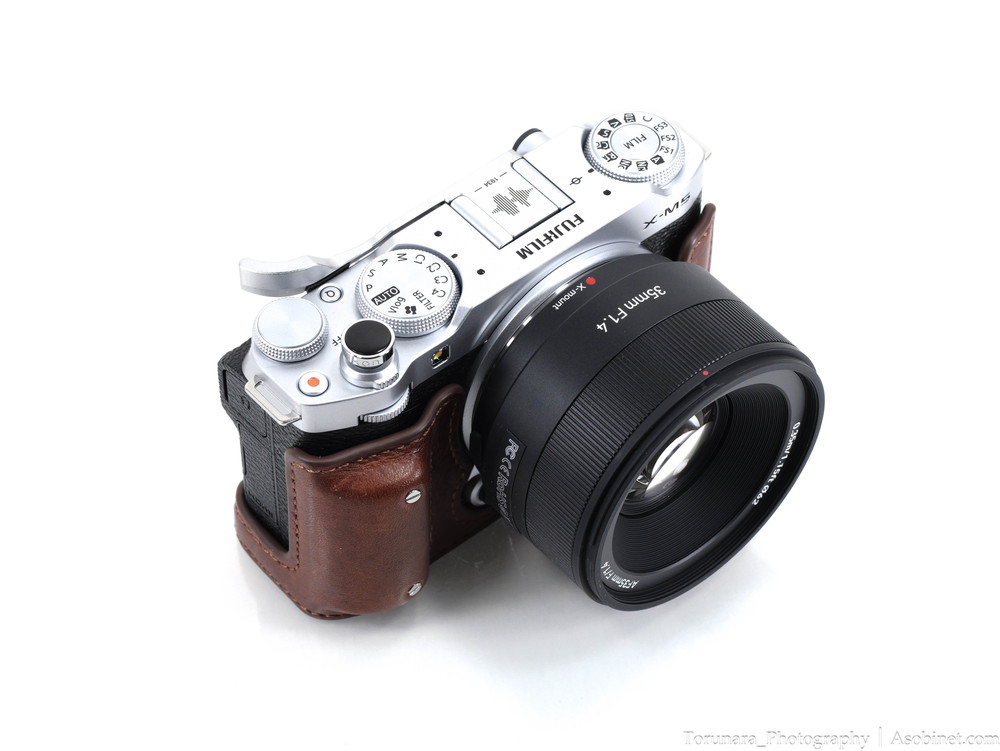 X-M5に装着。小型軽量ボディと相性の良いF1.4レンズです。レンズ全長が短いため、カメラシステム全体の奥行が嵩張らず、カメラバッグへの収納が容易。また、片手でも扱えるほど軽量で、フロントヘビーとは感じません。