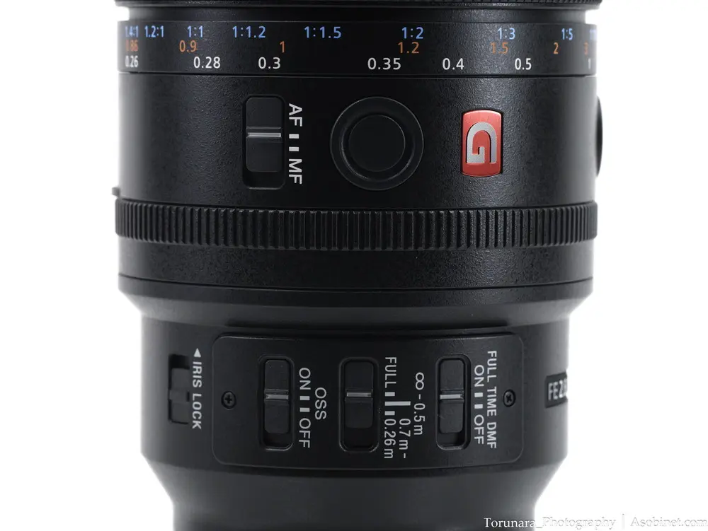 FE 90mm F2.8 Macroの操作系を継承しつつ、絞りリングなどを追加。フォーカスはフローティング方式のXDリニアモーター駆動となり、(キヤノンRFと同じく)最大撮影倍率「×1.4」に対応。さらにミラーレス用のマクロレンズとしては珍しいテレコンバージョンレンズ対応を実現。
