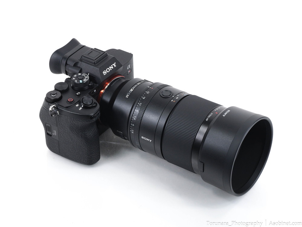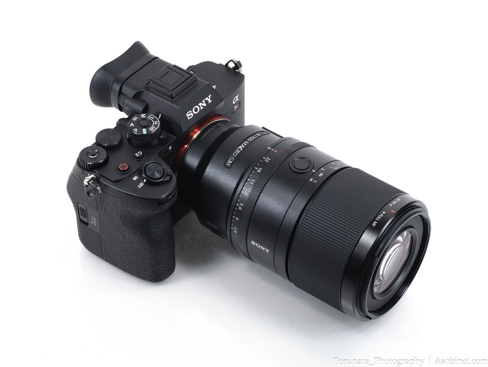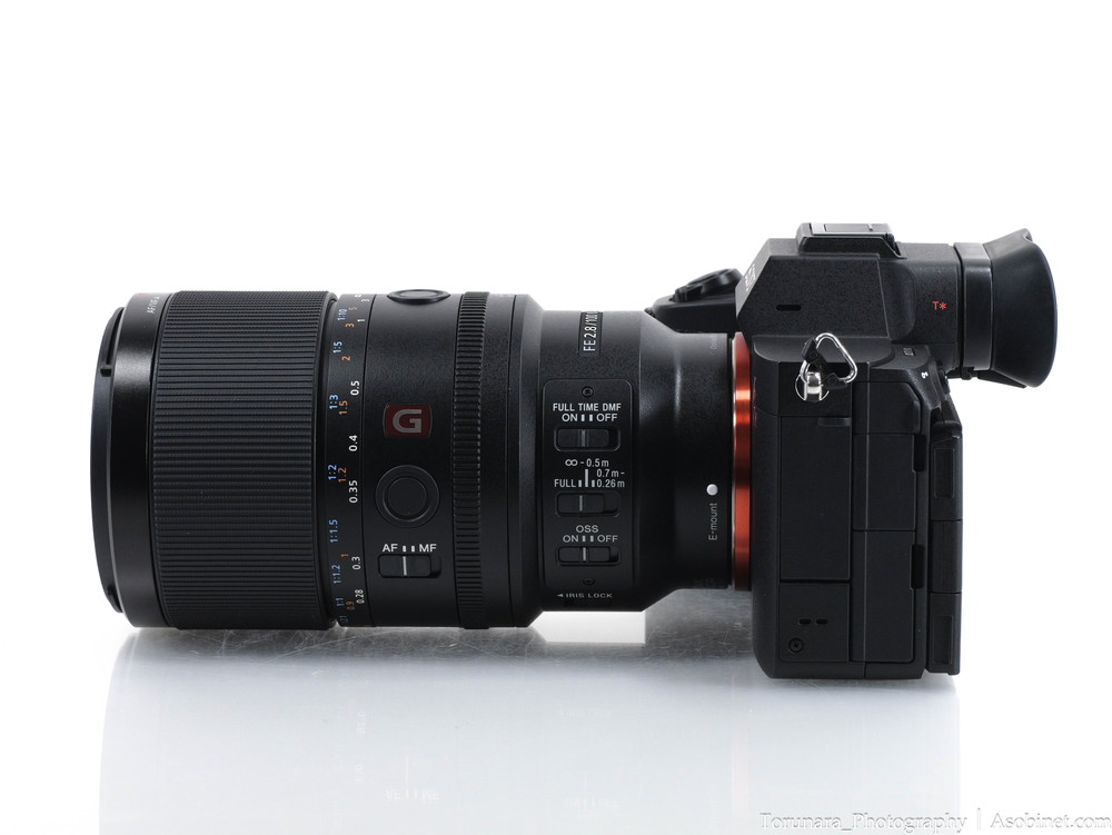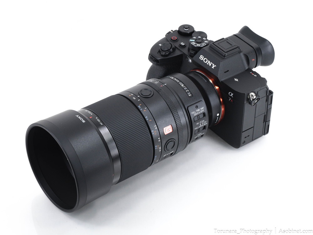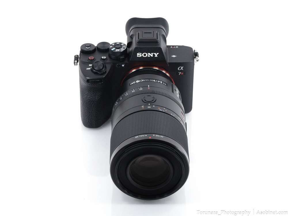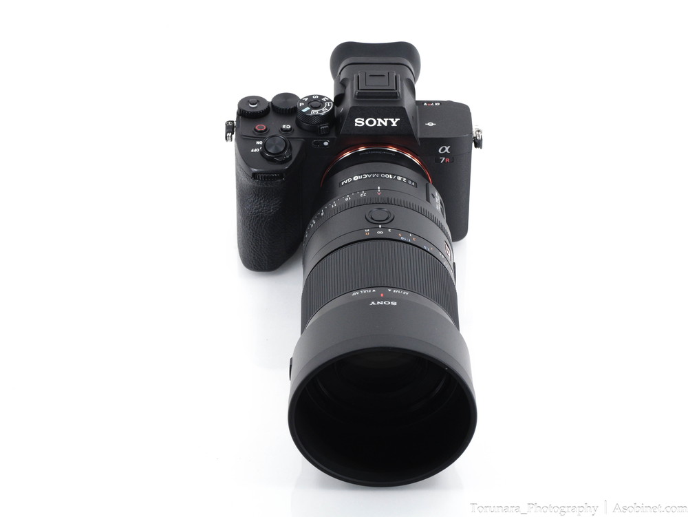 α7R IVに装着。100mm F2.8 マクロレンズとしては適度なサイズ・重量。過度なフロントヘビーとならずバランスは良好です。片手での操作もなんとか可能。