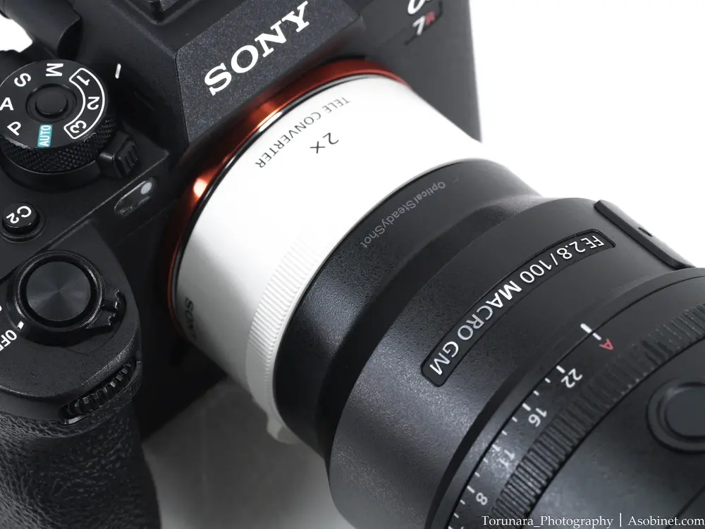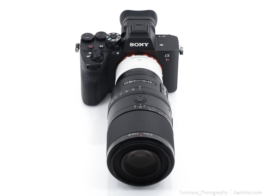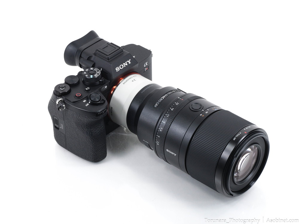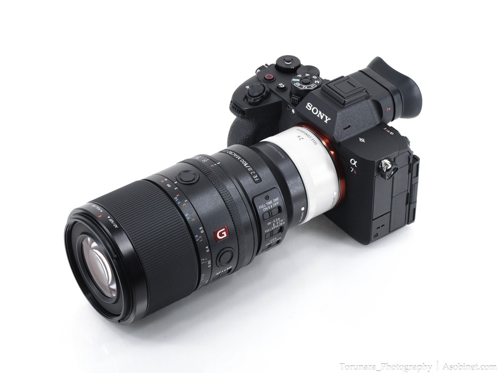 ×1.4・×2.0テレコンバージョンレンズに対応。白色のテレコンを間に挟むと奇妙な外観ですが、撮影に支障はありません。×2.0装着時は焦点距離が200mmとなり、開放F値がF5.6まで上昇します。