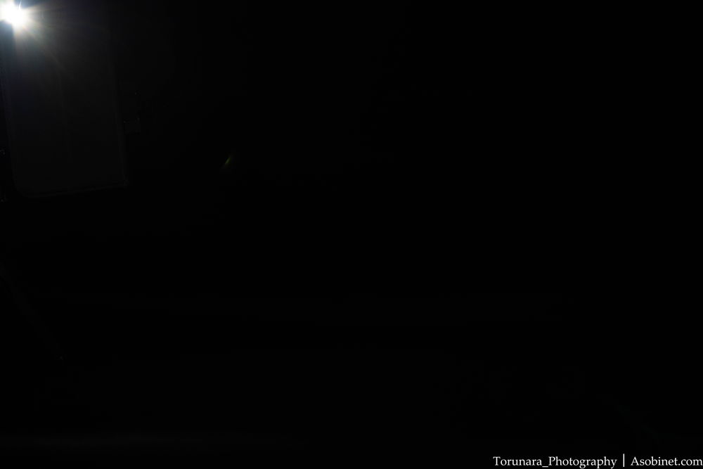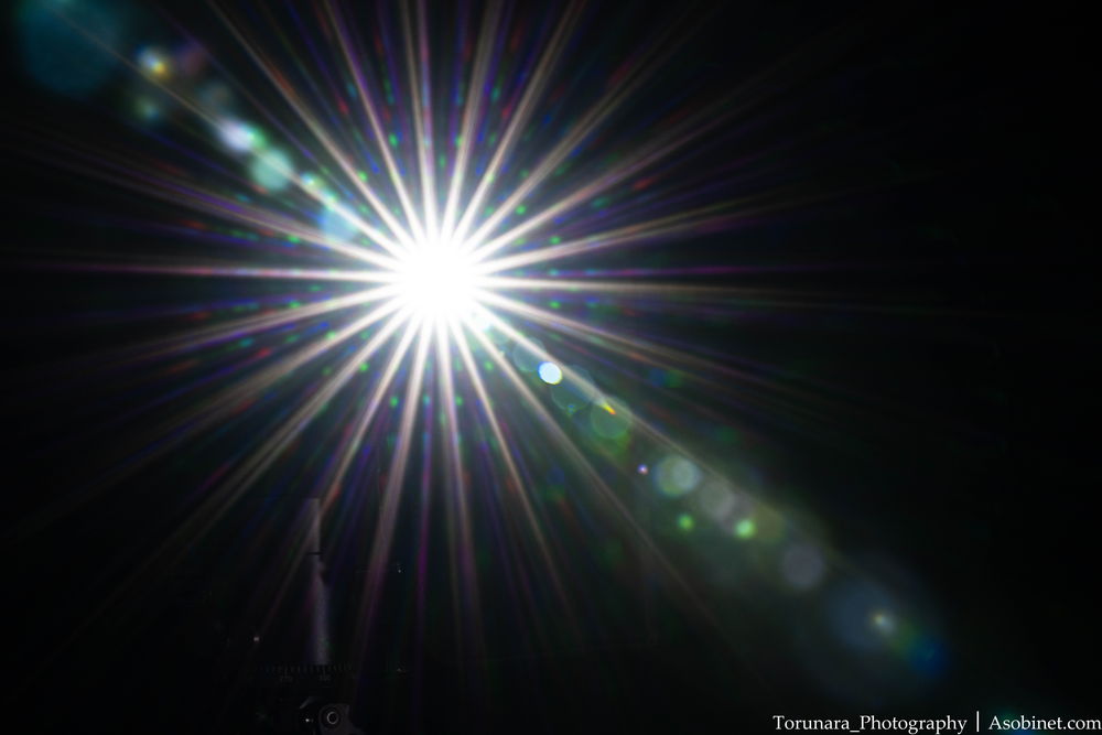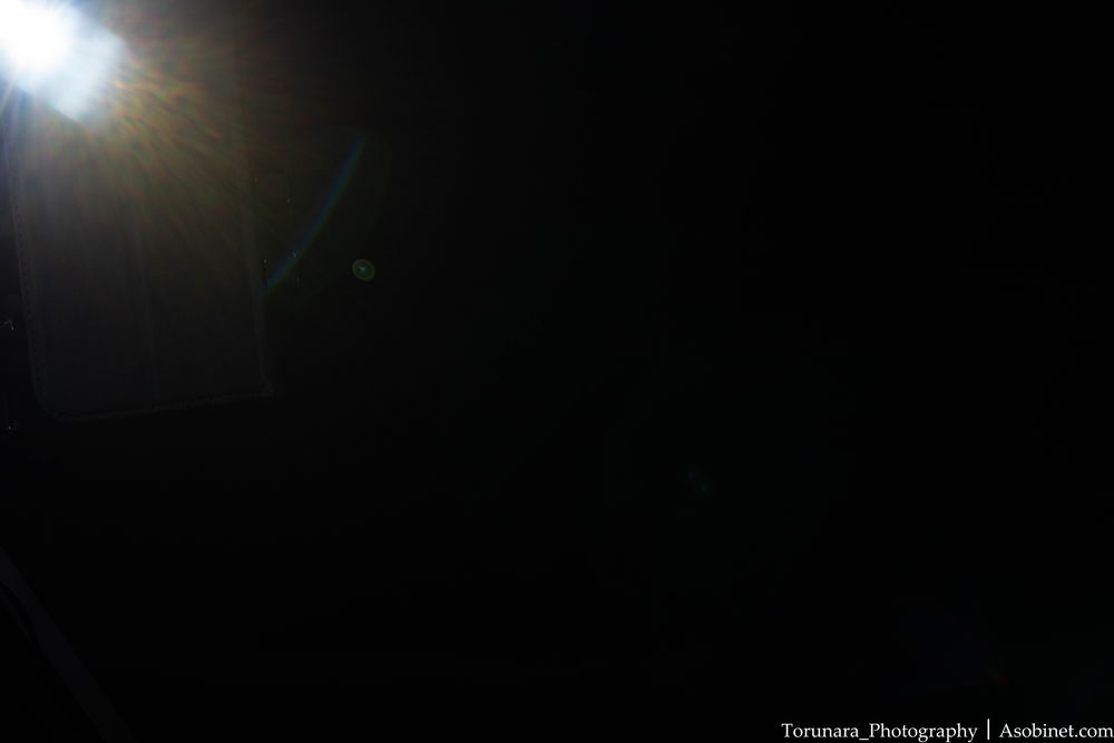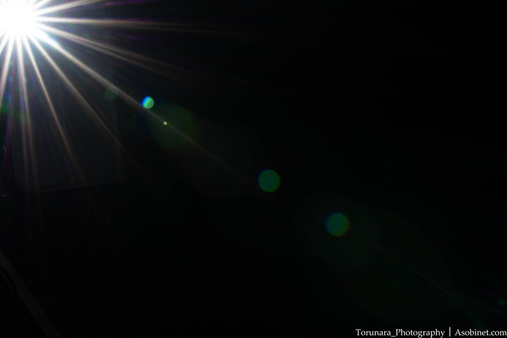光源付近にフレアとゴーストが発生するものの、広い範囲に影響を及ぼすものではありません。ただし、絞ると隠れていたフレアが収束し、やや目立つゴーストが複数発生します。