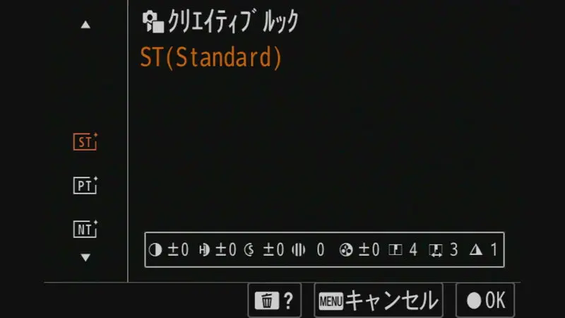 「ST=standard」「PT=portrait」「VV=vivid」「NT=neutral」などはクリエイティブスタイルのプリセット名と同じ。長年のソニーユーザーであればすぐ慣れるはず。