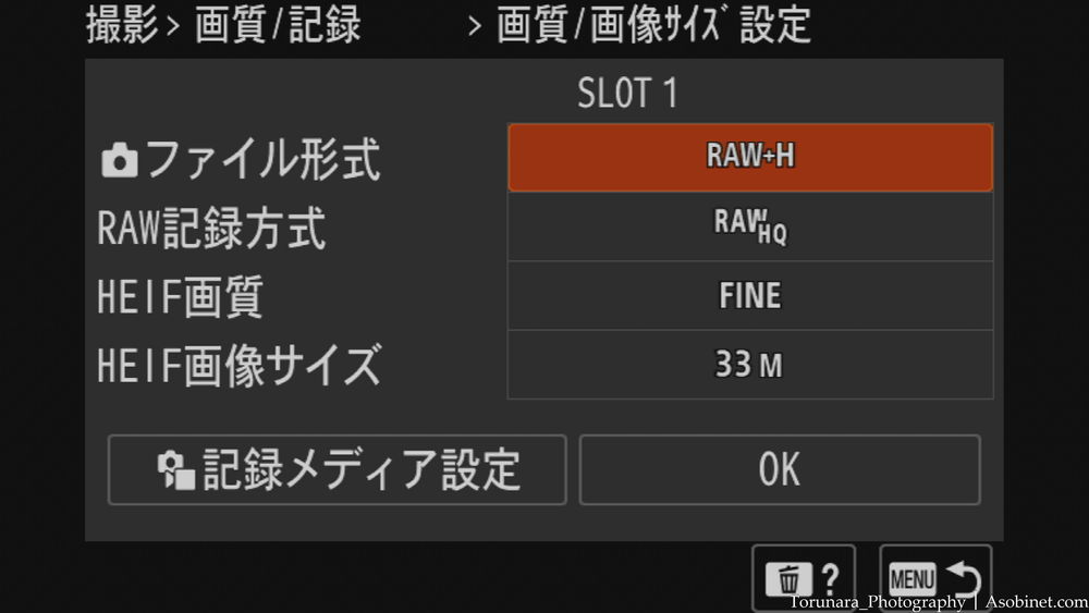 項目によっては改善が見られ、例えば「画質/画像サイズ設定」は旧メニューの「ファイル形式」「RAW記録方式」「JPEG画質」「JPEGサイズ」が一つに統合されています。一度に複数の設定の項目を調整できるので、作業の効率化に繋がるし、マイメニューに登録する場合は省スペース化に繋がります。さらに、この設定項目から「記録メディア設定」へ移行することも可能。移行先から画質設定に戻るためのボタンも用意されています。