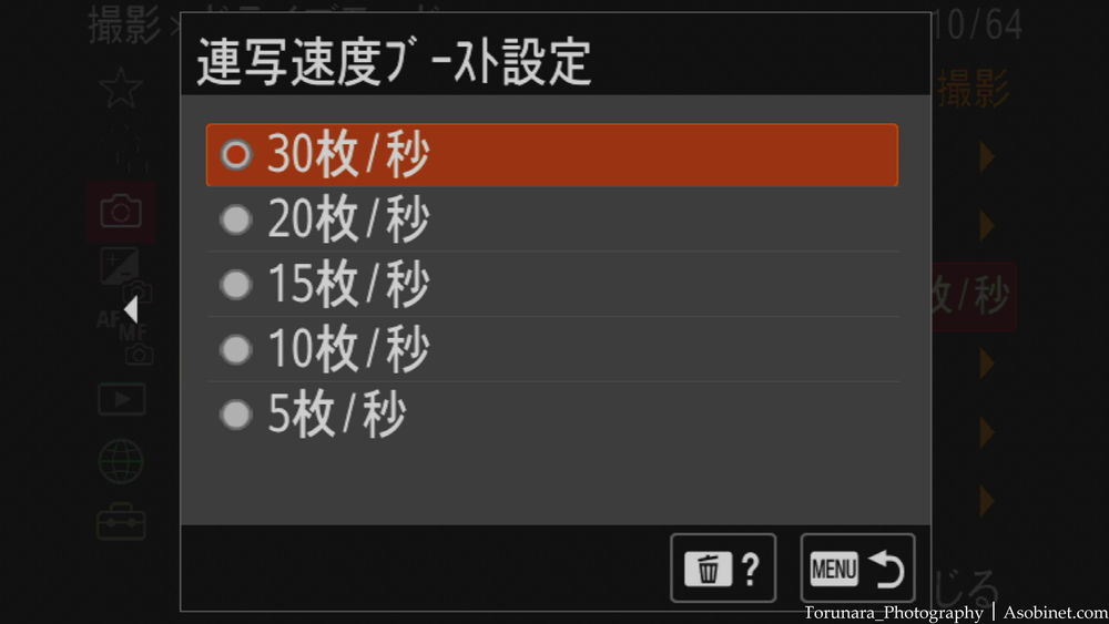 新機能の連写速度ブースト設定は、一時的に任意の連写速度にドライブモードを変更できる機能です。通常は10枚程度の程よい撮影速度を使い、ここぞというときに30コマ秒の高速連写が必要な時に使用します。割り当てたボタンを操作することで利用することが可能。逆に高速から低速に切り替えることもできます。