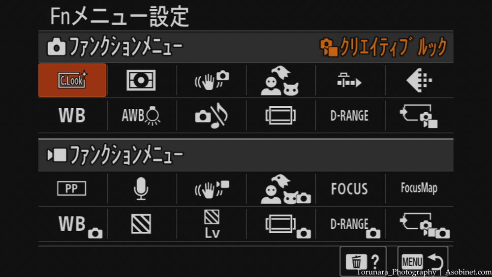 従来通り静止画・動画でそれぞれ10枠のFnメニューをカスタマイズ可能。カメラにFnボタンが固定されているほか、モニター画面の上方向スワイプで呼び出せるようになったので、使う機会が増えそうです。(後述)