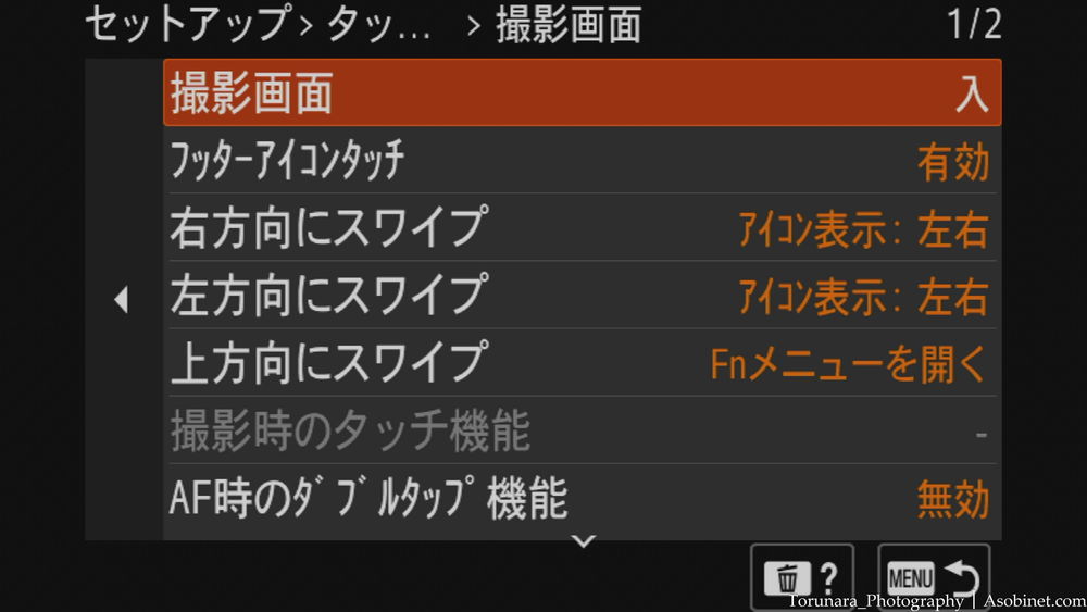 新しいコントロールとして、タッチパネルをスワイプすることでタッチ操作に適したパネルを呼び出したり、Fnメニューを開いたりすることができます。富士フイルムのように、4方向に機能を直接登録することができないのは惜しい(ボタンカスタマイズのように機能を割り当てられるわけではない)。