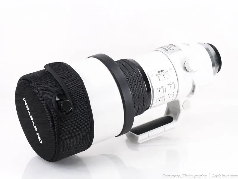 カーボン製の大きな円筒型レンズフードが付属。サイズは大きいものの、非常に軽量。外側は本体と同じ白色の塗装、内側は反射を抑えるフェルトのような生地が張り付けられています。