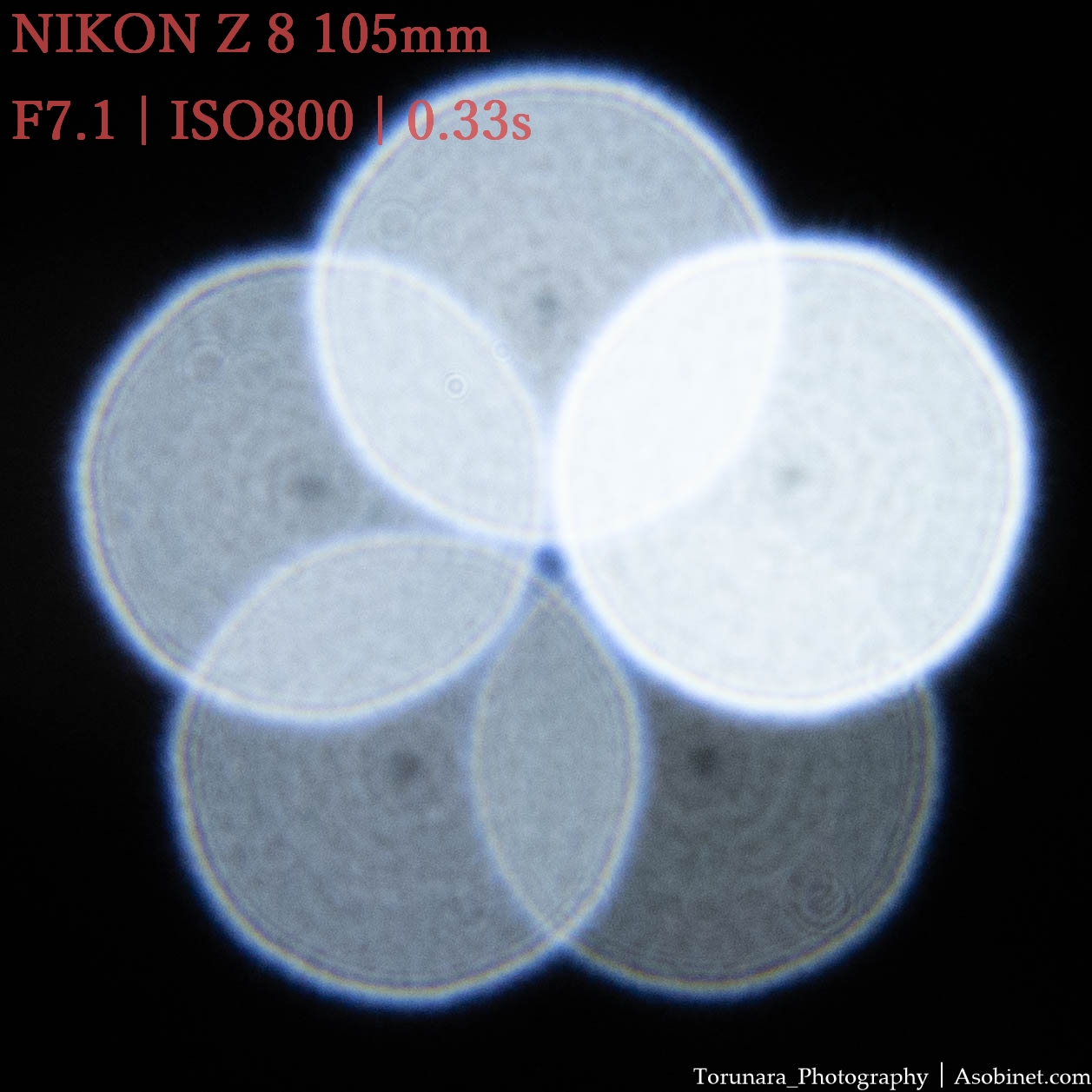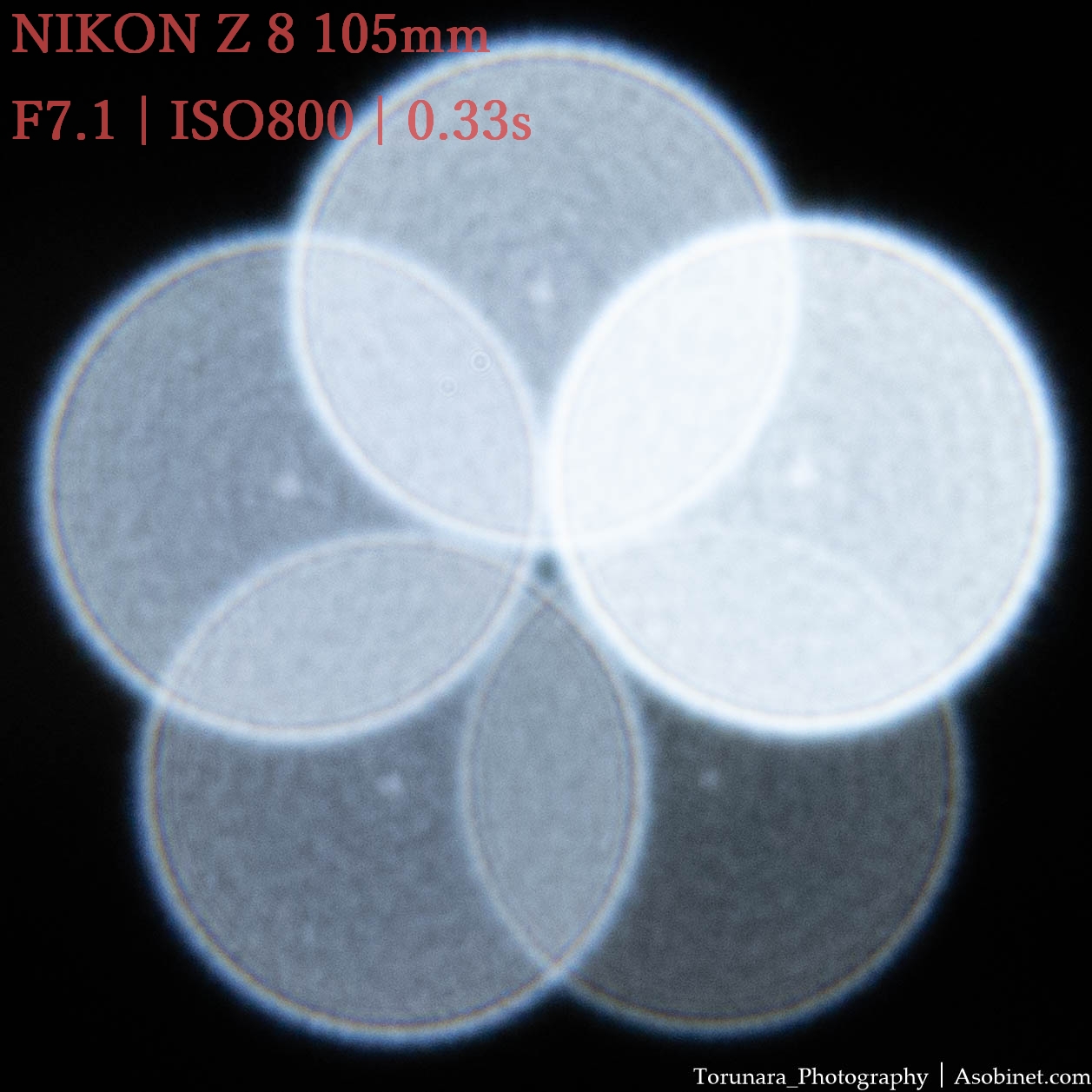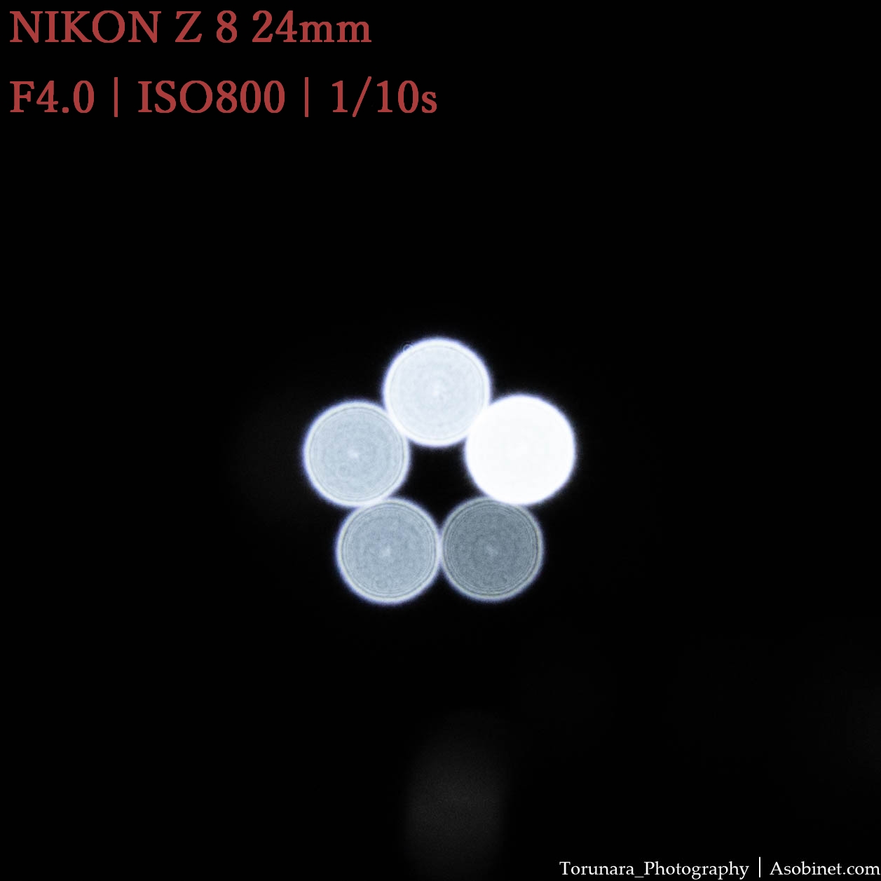 極端な収差は残っていません。前後のボケを見比べてみると、中央の「点」以外は良く補正されているように見えます。この「点」は小さな玉ボケで不快な描写となる場合があります。個体差の問題なのか、どの24-105mm F4-7.1でもこうなるのかは不明。