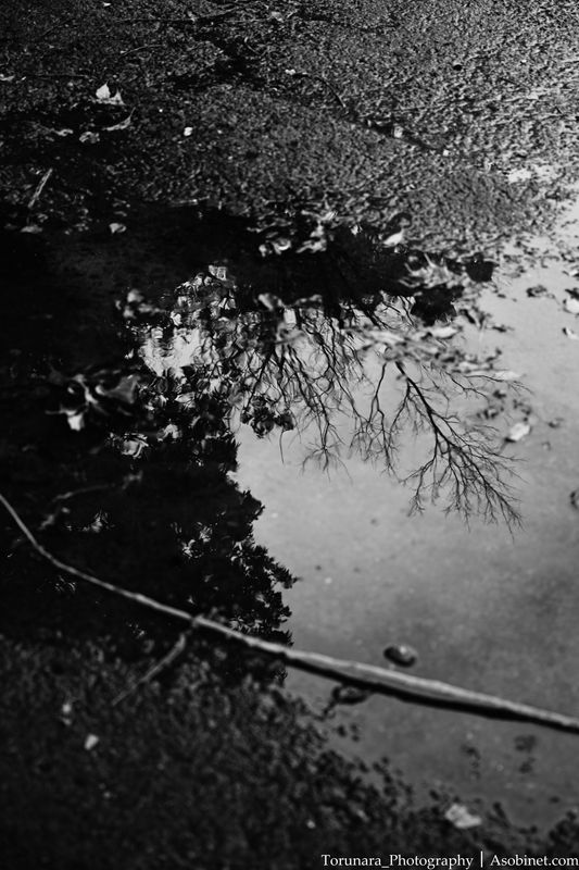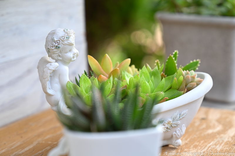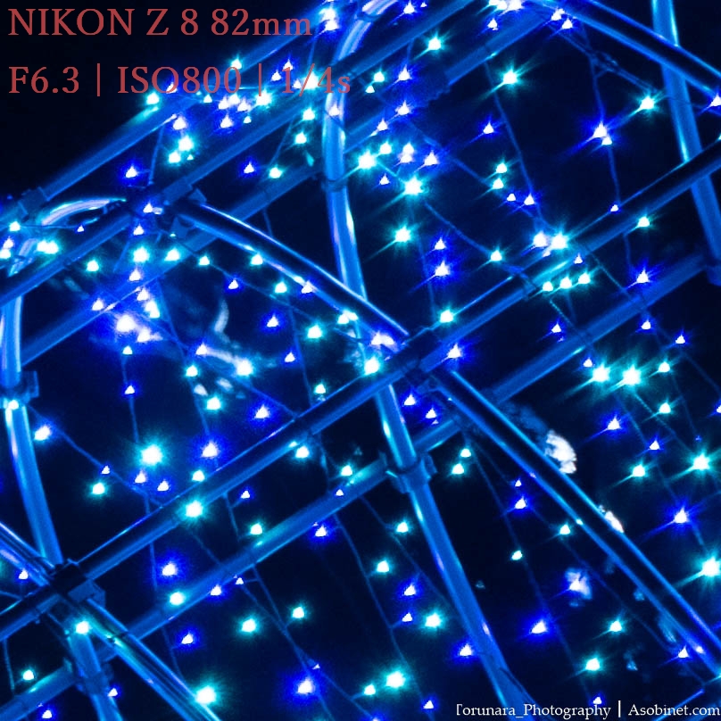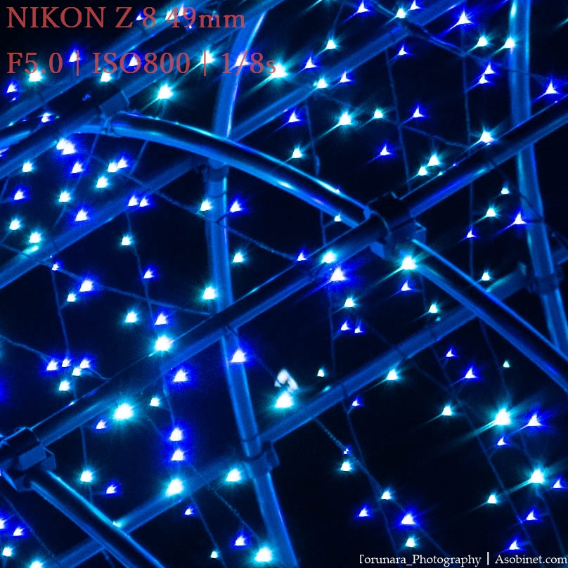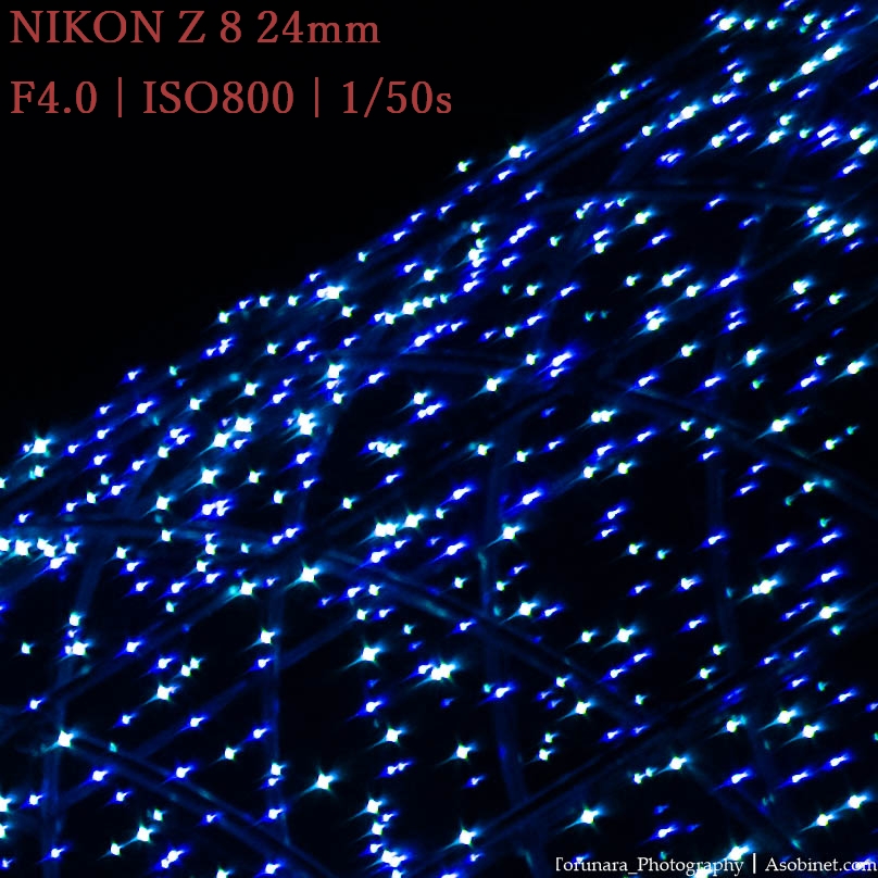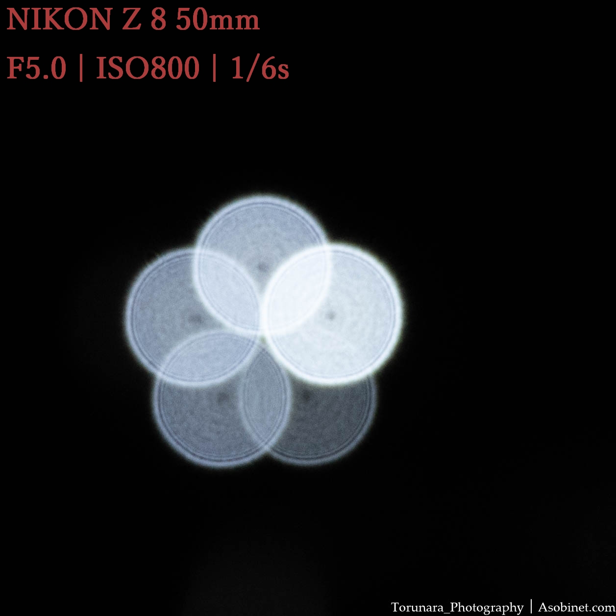 極端な収差は残っていません。前後のボケを見比べてみると、中央の「点」以外は良く補正されているように見えます。この「点」は小さな玉ボケで不快な描写となる場合があります。個体差の問題なのか、どの24-105mm F4-7.1でもこうなるのかは不明。